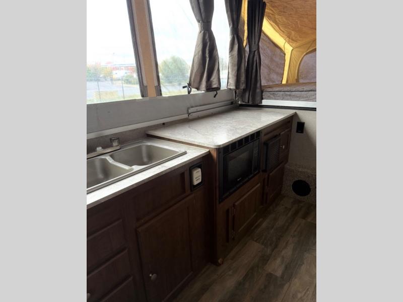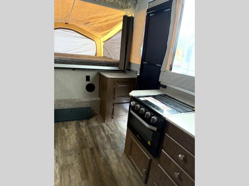 Your family of five or six can enjoy camping above ground in this camper with two tent end beds giving you more interior floor space and a slide out U-shaped dinette. The cook will love having the choice of making meals inside with full amenities including a three-way refrigerator or outside on the slide out kitchen and griddle. And you can dine under the 13' awning or back inside at the dinette. You will find plenty of storage in the cabinets and the shower/cassette toilet with curtain offer a wet bath to stay refreshed the whole trip.