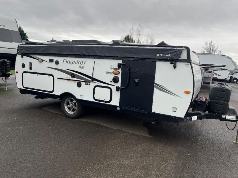 With any Forest River Flagstaff High Wall folding pop-up, the tent camper construction includes a fiberglass vacuum bonded radius roof with no center seam, five-piece Vinylon supreme tenting, EZ crank down stabilizer jacks with sand pads and full perimeter aluminum bed frames to mention a few features all on a powder coated tubular steel frame. More standard features include ProRac roof mounted cross bars with optional bike and kayak carrier attachments, solar prep on the frame, an outside shower to clean off the dirt from your shoes and toys, and a MORryde step. The indoors offers comfortable sleeping arrangements on the heated mattress on the tent bunk ends, raised panel cabinet doors, two bed end lights with a fan, privacy curtains with valances, and upgraded appliances. Make your lightweight camper selection today and start camping large!
