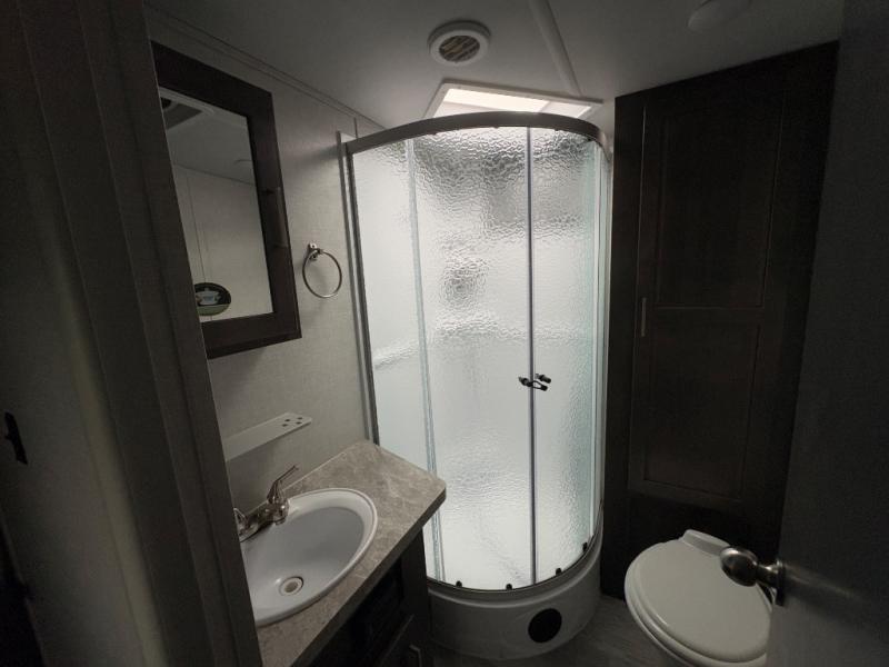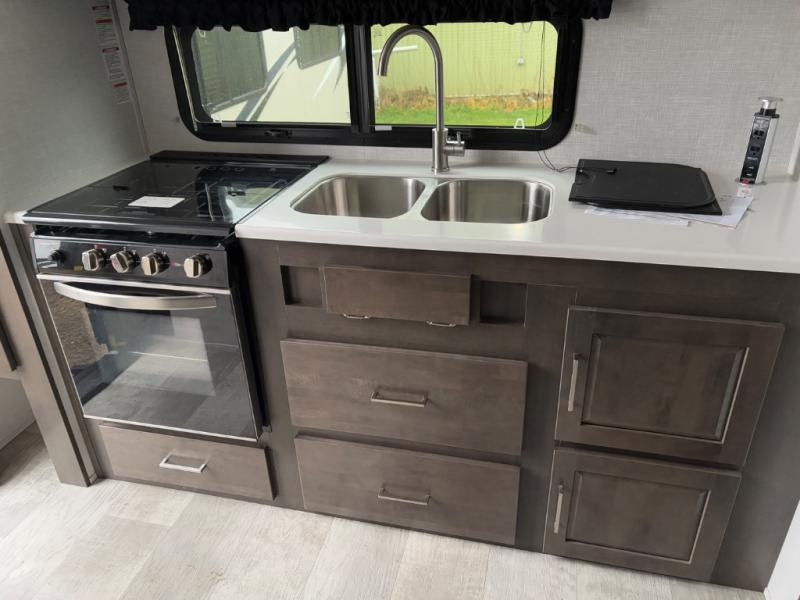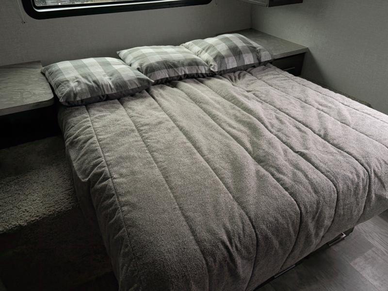 For any camping trip, you will want a Flagstaff Micro Lite travel trailer! These models have a beautiful Slatewood interior with hardwood cabinet doors and drawer fronts. Each unit features a WIFI Ranger Booster Sky 4 so that you can stay connected while you camp. Along the exterior there is a fully aluminium frame, an enclosed underbelly, and a radius roof with interior vaulted ceilings which provides you with the most headroom. Plus, an outside shower, outside speakers, and power awning with LED lights give added convenience to the exterior.