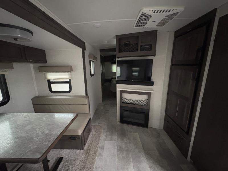 Your and your spouse will love this lightweight, easy-to-tow Flagstaff Micro Lite travel trailer. The dinette slide helps open up the living area and provides space for you to cook in the rear kitchen. After you've explored all day, come back to the trailer and enjoy a dinner at the dinette while the fireplace is going. The front bedroom with an RV queen bed is the perfect space to relax in each night. The bathroom is centrally located making it easy for everyone to get in and out. This trailer also has a drop-frame pass-through storage for your fishing poles and a convenient outdoor gas grill to enjoy cooking outside!