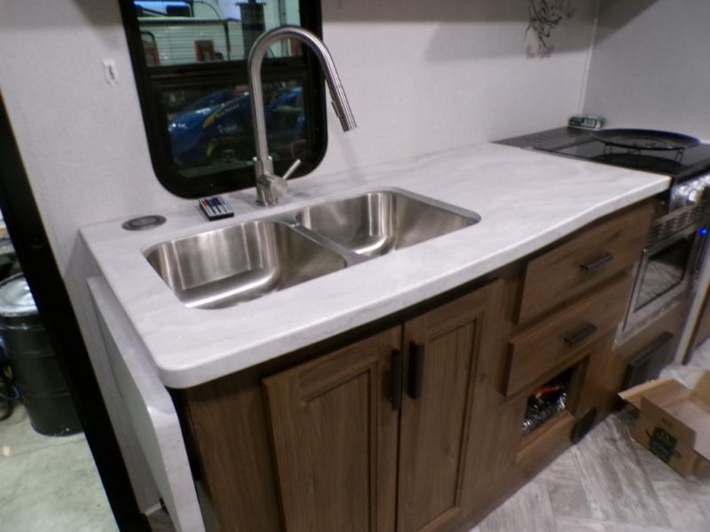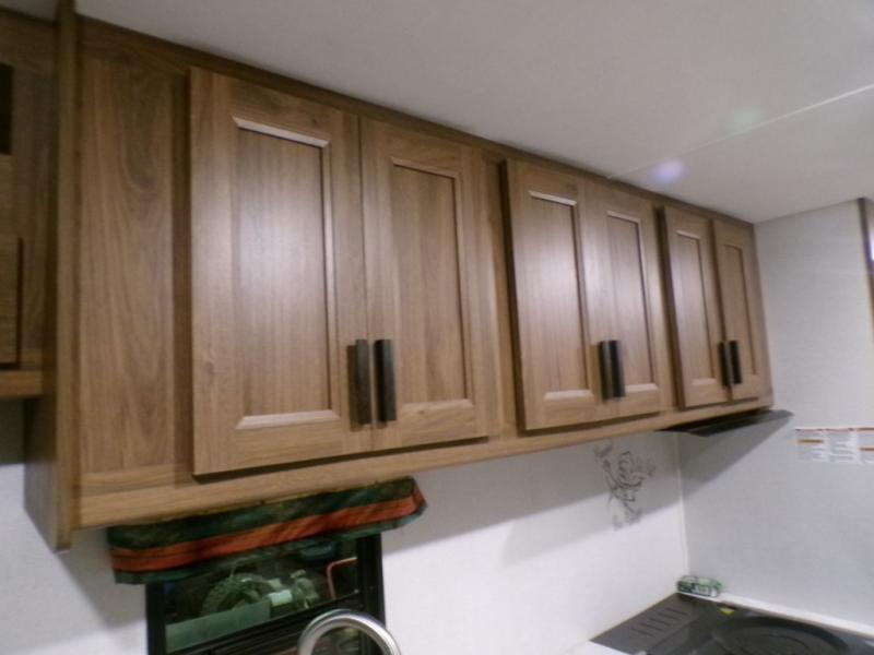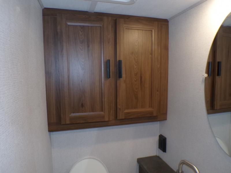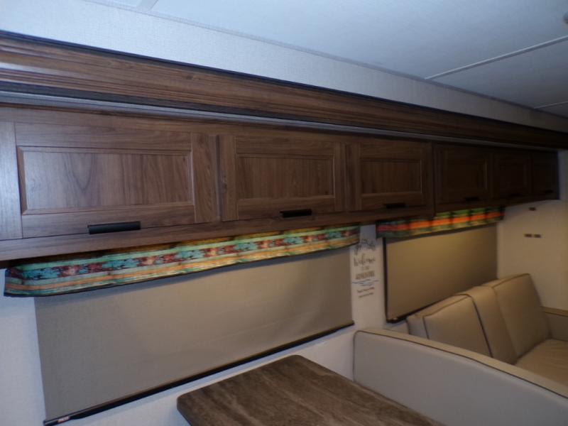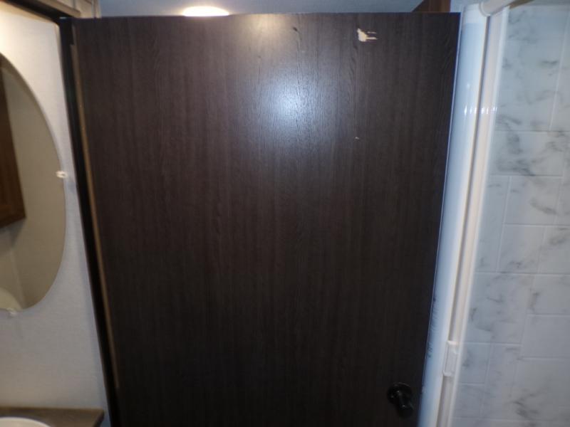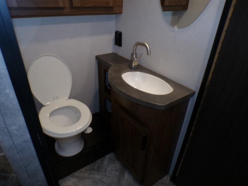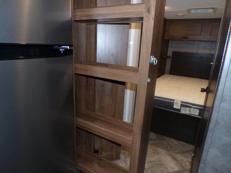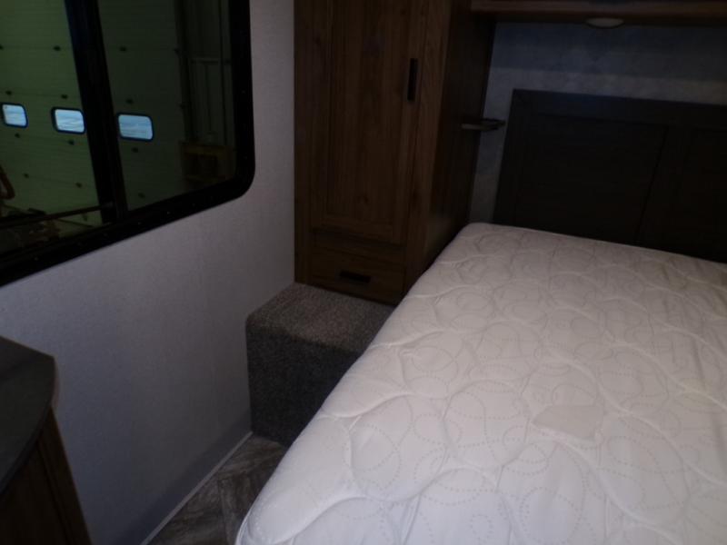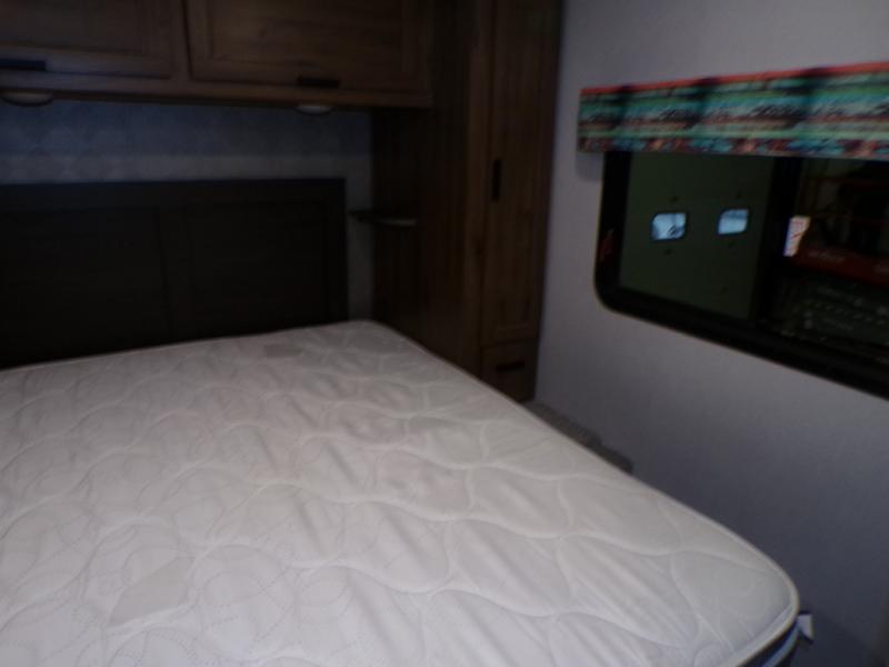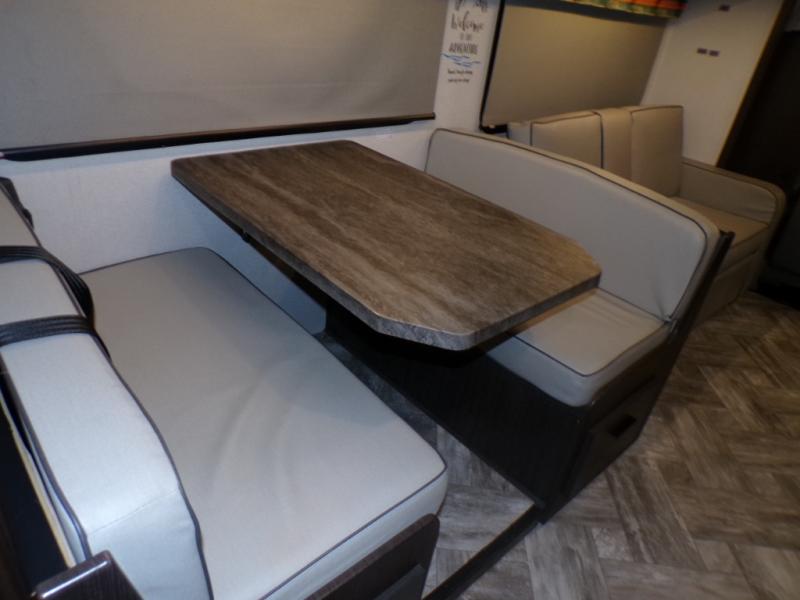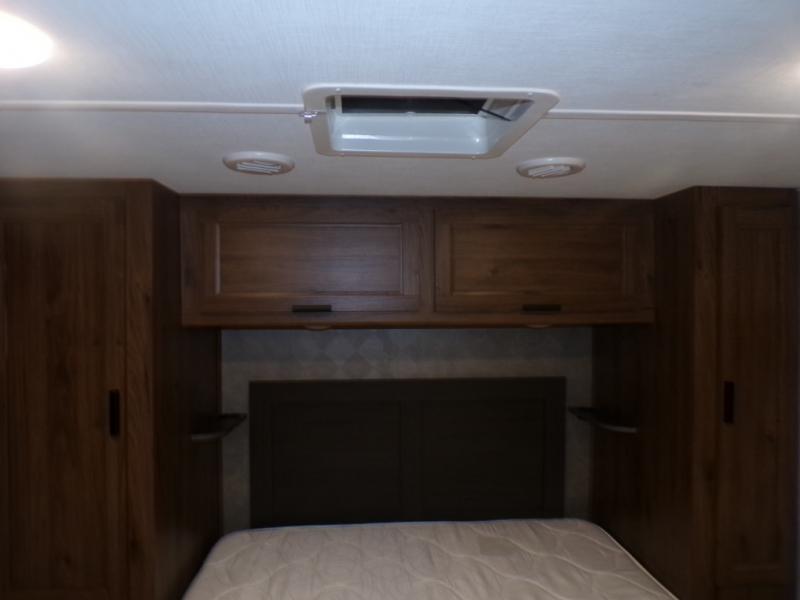 As you search for the perfect campgrounds to setup camp, you will enjoy the comfortable ride and views along the way in this coach! Once at your destination, you can relax on the sofa and booth dinette slide out, make a meal in the kitchen will full amenities including an undermount convection microwave, a 10 cu. ft. refrigerator, and a pantry. The flip-up countertop will come in handy as well. Everyone can watch the 12V LED TV that adjust, and get cleaned up in the split bathroom which offers a shower on one side of the coach and a private toilet and sink on the other. The private rear bedroom includes the bathroom, a walk-around queen bed and wardrobes on each side of the bed.