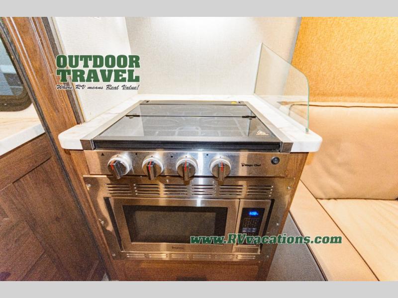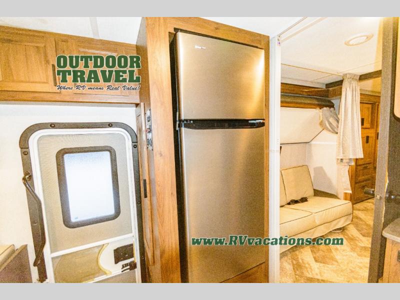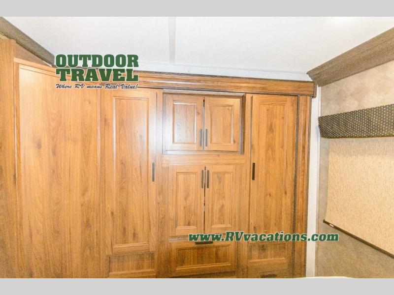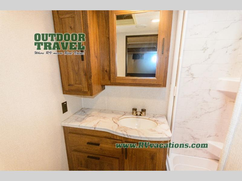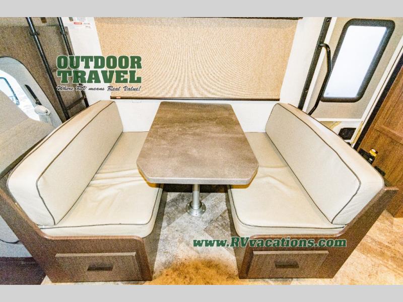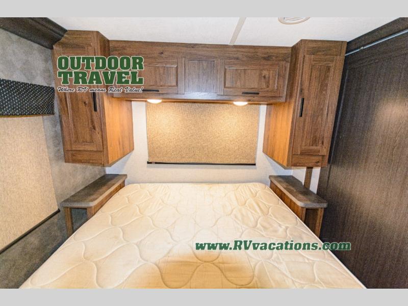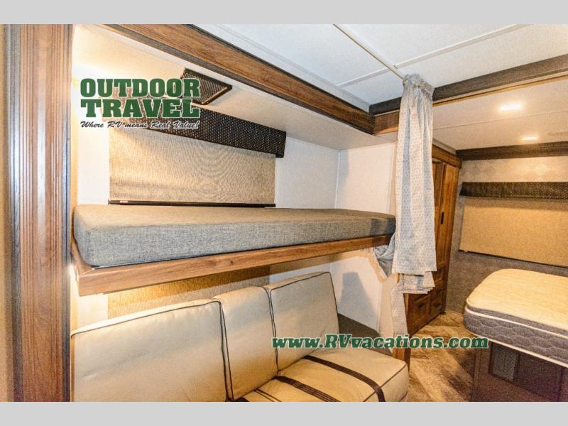 This RV is spacious thanks to the two large slides and the length of the coach, plus comfortable and convenient for a family to travel together thanks to the sleeping space provided when you utilize all the furniture and bunks. You will have your own privacy in the rear bedroom which provides a queen bed and nightstands, plus storage, and some will claim the kid's sofa sleeper with flip-down bunk above as their space. This area is across from the full bathroom which can be closed off by the dividers. The main living and kitchen area offers a sofa and booth dinette to relax and dine at, full amenities to keep everyone fed, plus there is a queen size bunk over cab that two will love to sleep on.