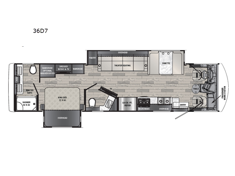 Travel with everything you need, plus some in this coach! You'll love the four person power theater seats with pop-up 110v outlets and USBs, plus recline, adjustable head rests, heat and massage functions, and the 5K BTU fireplace will make it feel more like home. The kitchen offers full amenities including a convection microwave, and the half bath will come in handy when someone else is taking a shower in the full rear bath. The dual-sink vanity allows two people to get ready for bed at once, and the king bed will be calling your name after a long trip. You might even choose to add options such as a stackable washer/dryer, dual pane windows, and mud flaps.