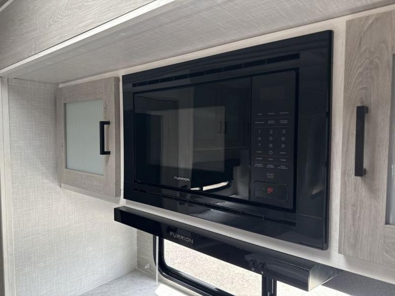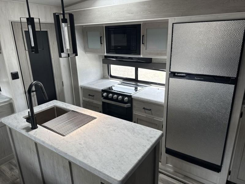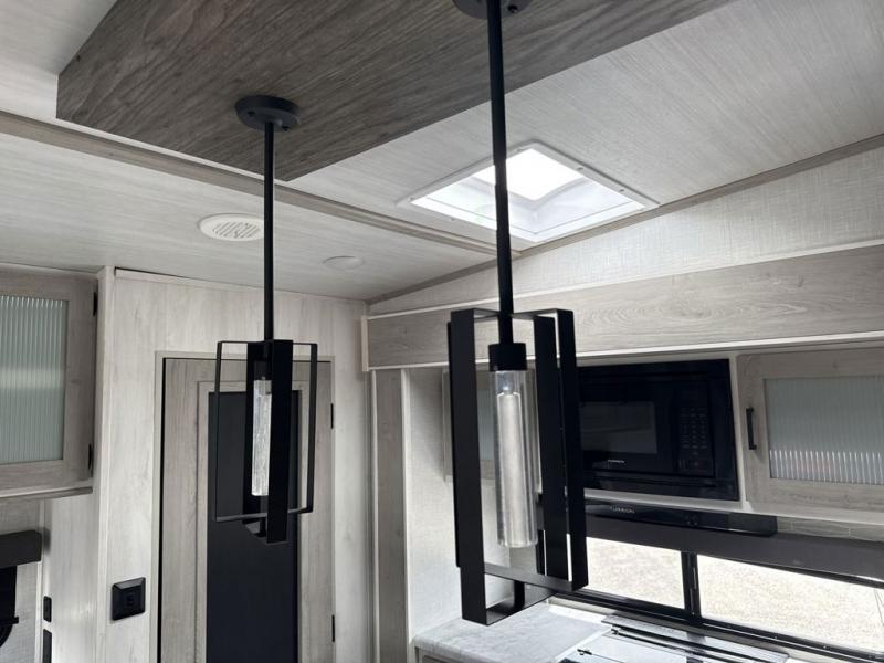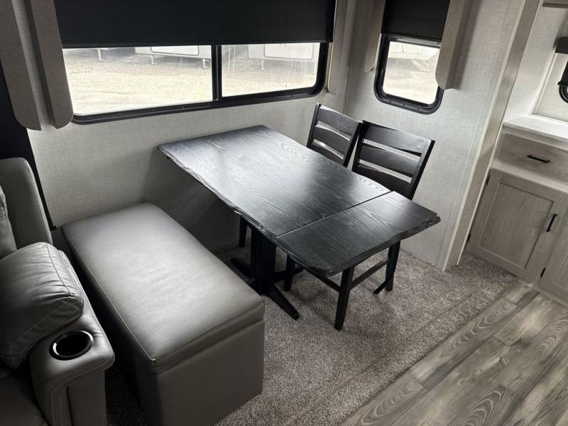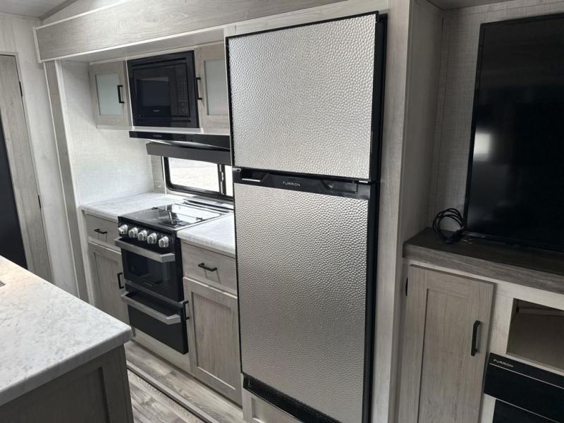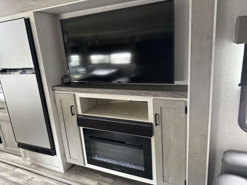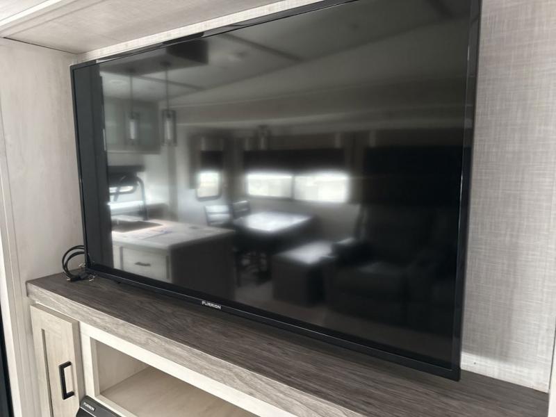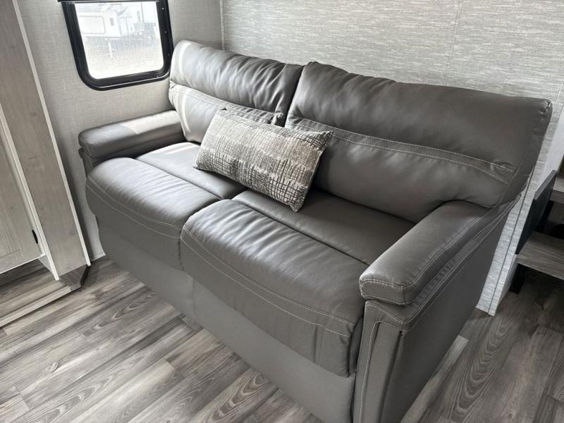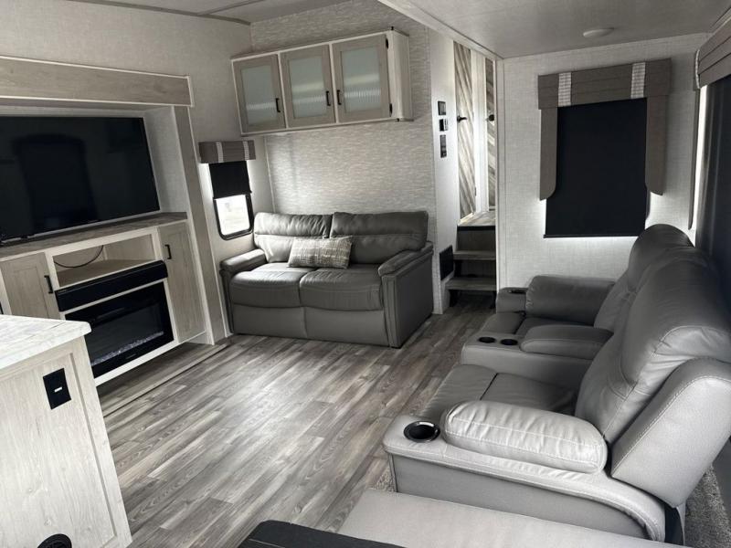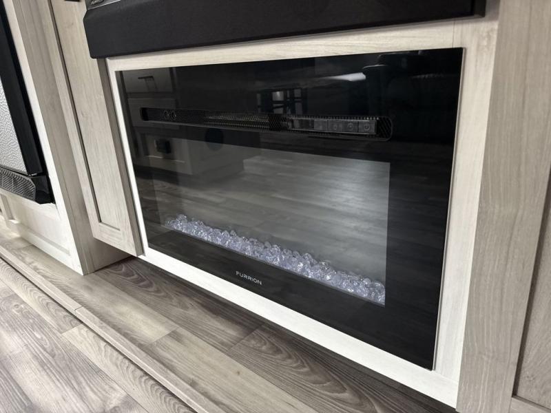 Enjoy luxury camping in this Impression fifth wheel. The dual opposing slides open up the kitchen and living area so your guests can relax and the chef of the family can prepare a meal. There is comfortable seating space on the tri-fold sofa, the theater seating with USB ports, and the free-standing table with a bench/ottoman. The 50" LED TV includes a soundbar for a great movie experience, plus there is a fireplace for a more at-home feel! Freshen up each day in the walk-in shower with a skylight, then head to the front private bedroom to get a great night's rest on the queen bed. You will find plenty of storage space in this model, including a floor to ceiling pantry, a hutch with upper and lower cabinets, plus an exterior unobstructed pass-through storage for fishing poles, tools, and lawn chairs!