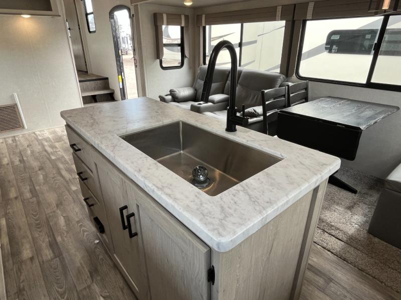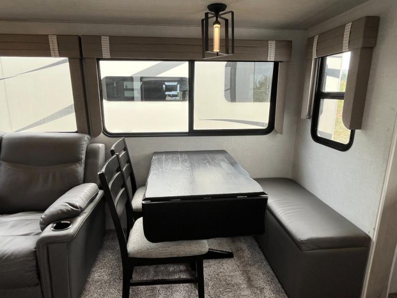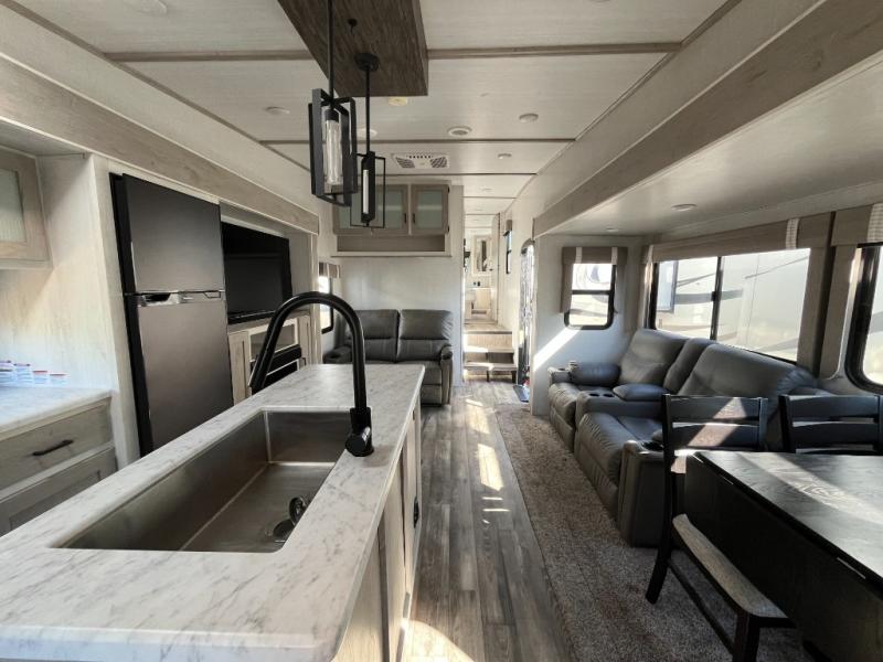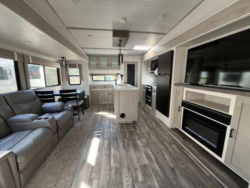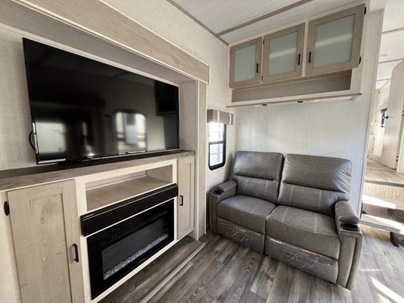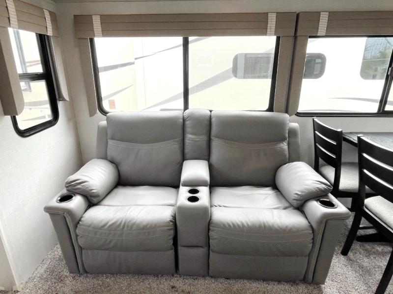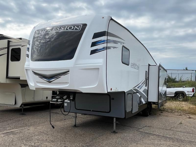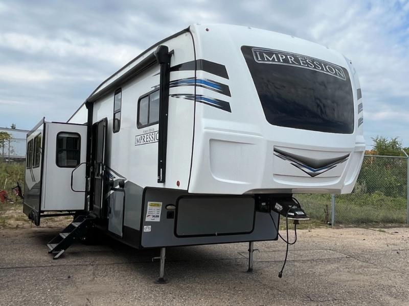 Enjoy luxury camping in this Impression fifth wheel. The dual opposing slides open up the kitchen and living area so your guests can relax and the chef of the family can prepare a meal. There is comfortable seating space on the tri-fold sofa, the theater seating with USB ports, and the free-standing table with a bench/ottoman. The 50" LED TV includes a soundbar for a great movie experience, plus there is a fireplace for a more at-home feel! Freshen up each day in the walk-in shower with a skylight, then head to the front private bedroom to get a great night's rest on the queen bed. You will find plenty of storage space in this model, including a floor to ceiling pantry, a hutch with upper and lower cabinets, plus an exterior unobstructed pass-through storage for fishing poles, tools, and lawn chairs!