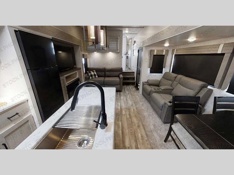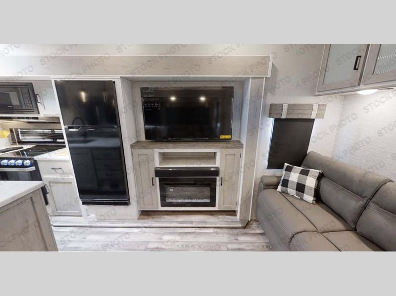 Enjoy luxury camping in this Impression fifth wheel. The dual opposing slides open up the kitchen and living area so your guests can relax and the chef of the family can prepare a meal. There is comfortable seating space on the tri-fold sofa, the theater seating with USB ports, and the free-standing table with a bench/ottoman. The 50" LED TV includes a soundbar for a great movie experience, plus there is a fireplace for a more at-home feel! Freshen up each day in the walk-in shower with a skylight, then head to the front private bedroom to get a great night's rest on the queen bed. You will find plenty of storage space in this model, including a floor to ceiling pantry, a hutch with upper and lower cabinets, plus an exterior unobstructed pass-through storage for fishing poles, tools, and lawn chairs!