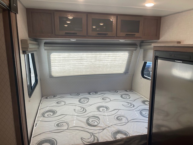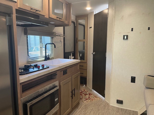 The 60" x 22" panoramic front window allows you to see out into the campgrounds or the mountains depending on where you decide to set up camp! After hiking the trails or climbing the cliffs, you can get cleaned up in the radius shower in the full bathroom and take a nap on either the sofa slide or the RV queen bed. When you are ready for a warm meal, the galley kitchen offers a two-burner stovetop and a 5-cu. ft. refrigerator. You will find storage throughout the inside as well as in the pass-through compartment outside and on the roof with the Rhino rack RVT track!