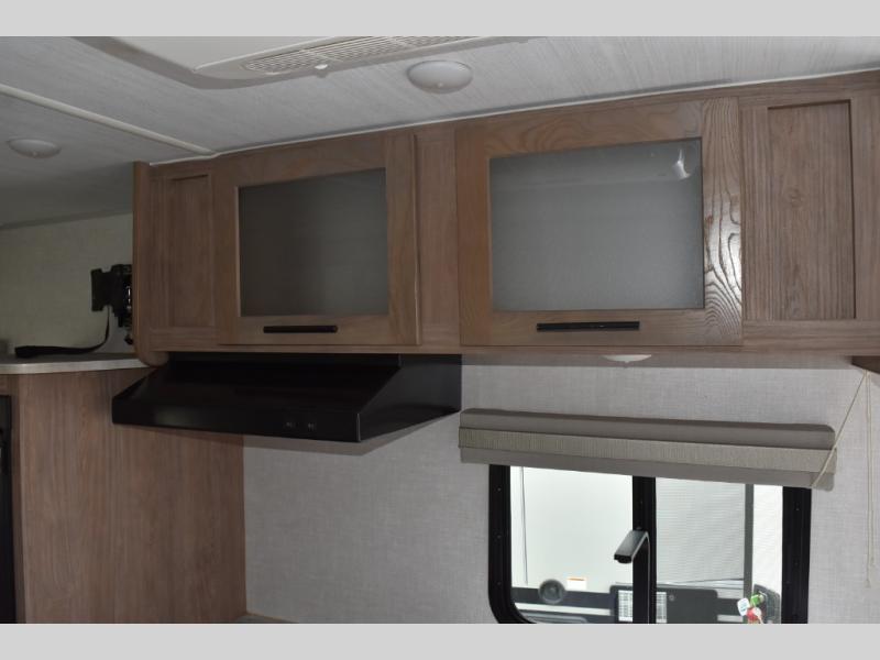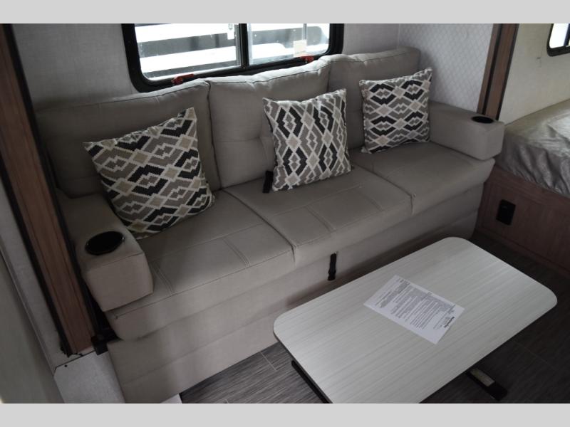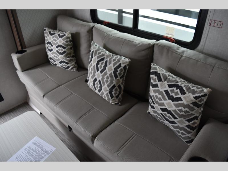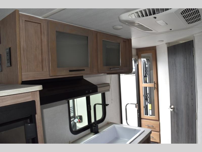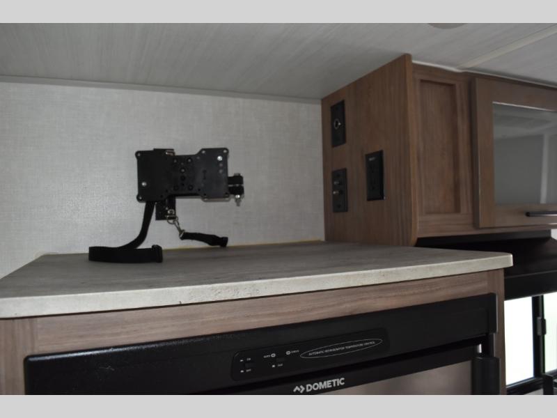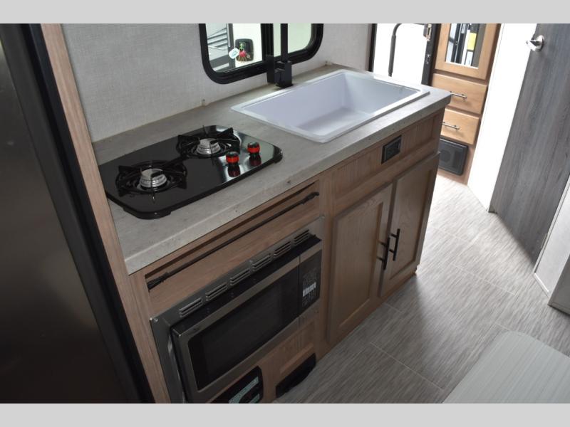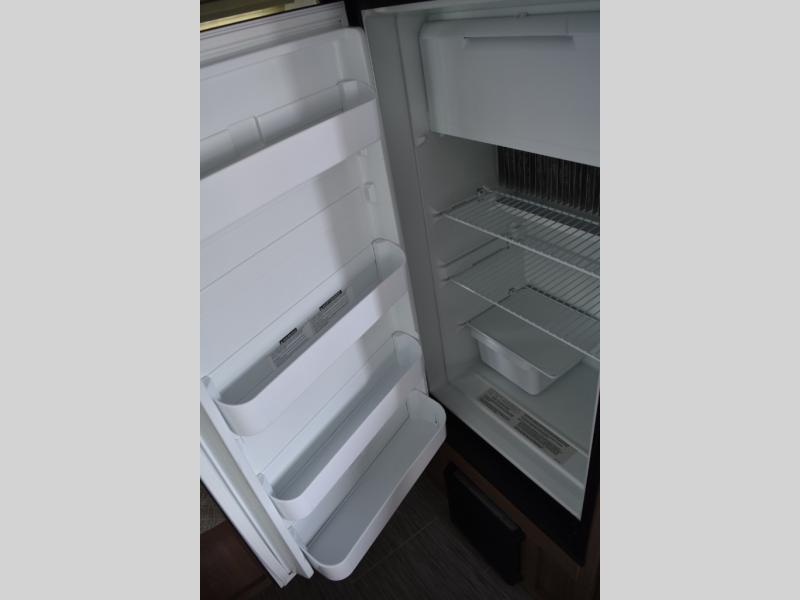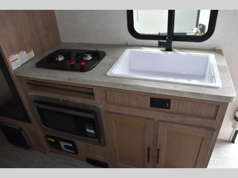 The 60" x 22" panoramic front window allows you to see out into the campgrounds or the mountains depending on where you decide to set up camp! After hiking the trails or climbing the cliffs, you can get cleaned up in the radius shower in the full bathroom and take a nap on either the sofa slide or the RV queen bed. When you are ready for a warm meal, the galley kitchen offers a two-burner stovetop and a 5-cu. ft. refrigerator. You will find storage throughout the inside as well as in the pass-through compartment outside and on the roof with the Rhino rack RVT track!