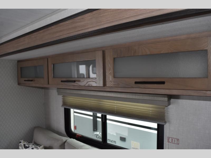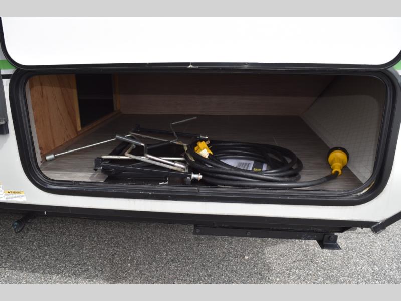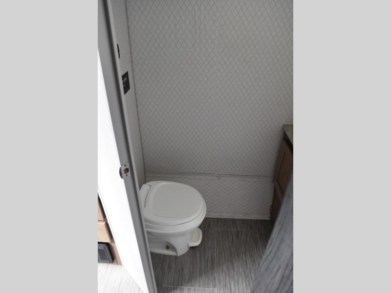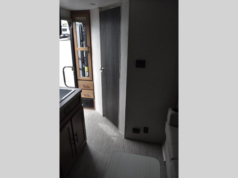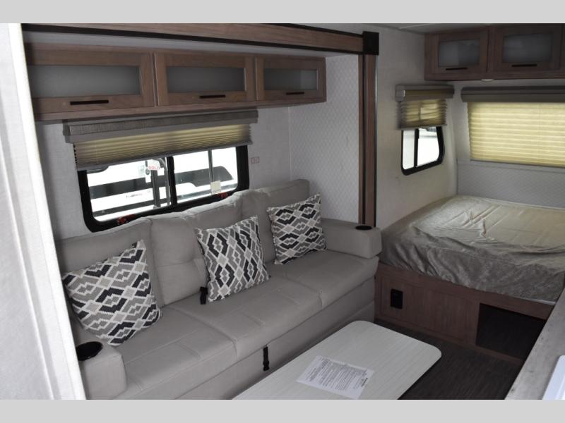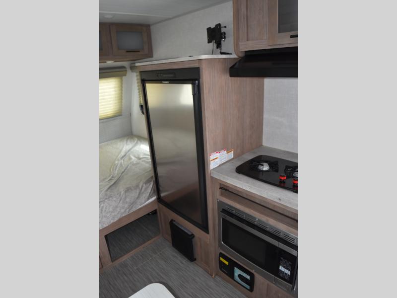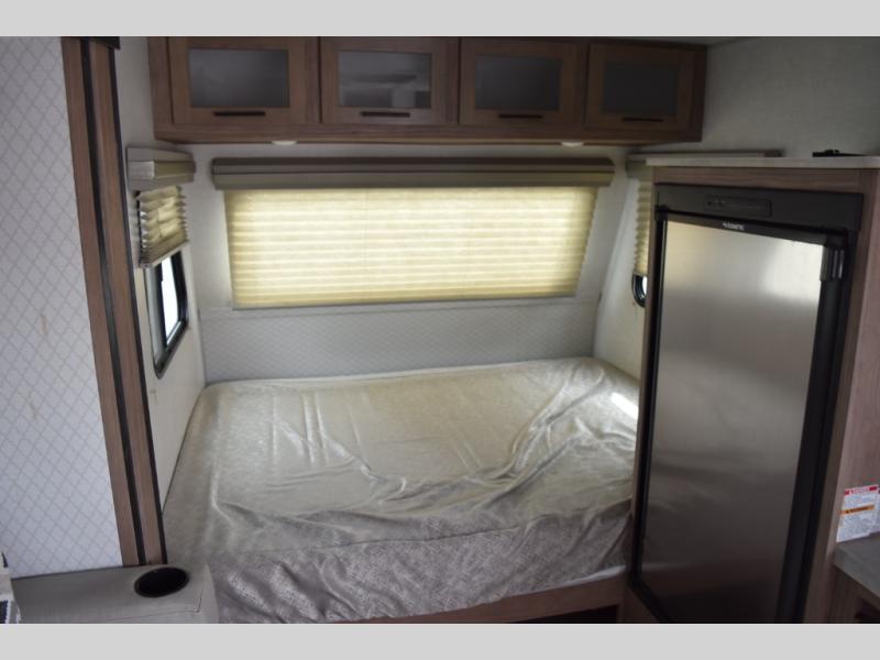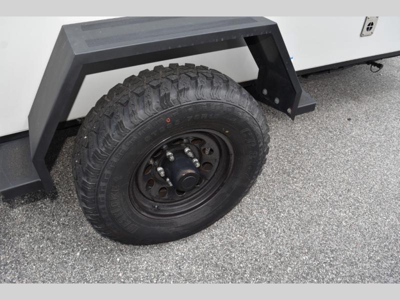 The 60" x 22" panoramic front window allows you to see out into the campgrounds or the mountains depending on where you decide to set up camp! After hiking the trails or climbing the cliffs, you can get cleaned up in the radius shower in the full bathroom and take a nap on either the sofa slide or the RV queen bed. When you are ready for a warm meal, the galley kitchen offers a two-burner stovetop and a 5-cu. ft. refrigerator. You will find storage throughout the inside as well as in the pass-through compartment outside and on the roof with the Rhino rack RVT track!