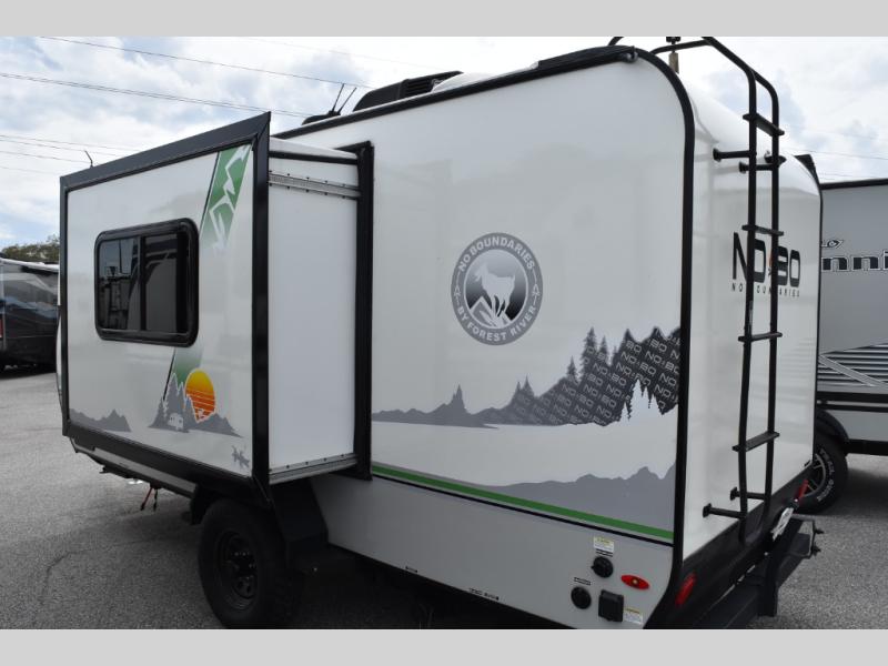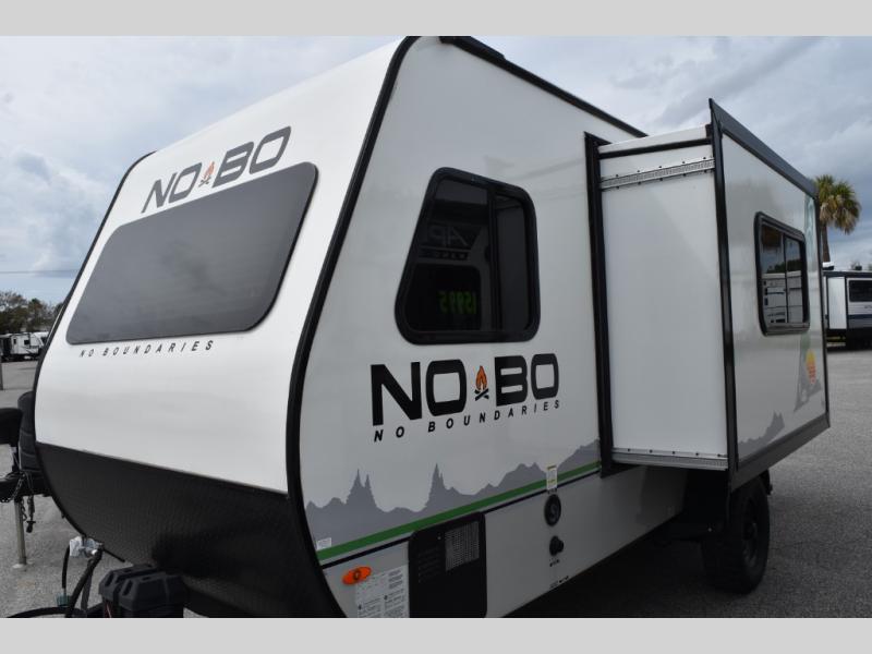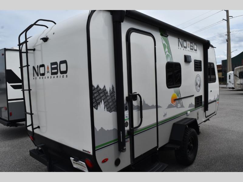 The No Boundaries travel trailers and toy haulers by Forest River are easy to tow by a four or six-cylinder vehicle because they range in weights from under 2,000 pounds up to 5,000 pounds. Depending on the model you choose, you will find independent torsion suspension with industry-leading cargo capacity, six-lug satin black aluminum wheels and All-Terrain tires, frame-mounted walkable steel fenders, a laminated Azdel exterior, a Cold Weather package, and a fully walkable 500-LB roof with PVC roofing membrane. The interior offers an exclusive central vacuum system plus much more! You will find a NOBO in a 10 Series, 16 Series or a 19 Series to fit your extreme lifestyle, so make your selection today!