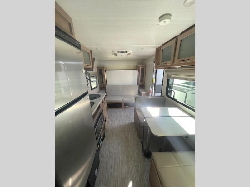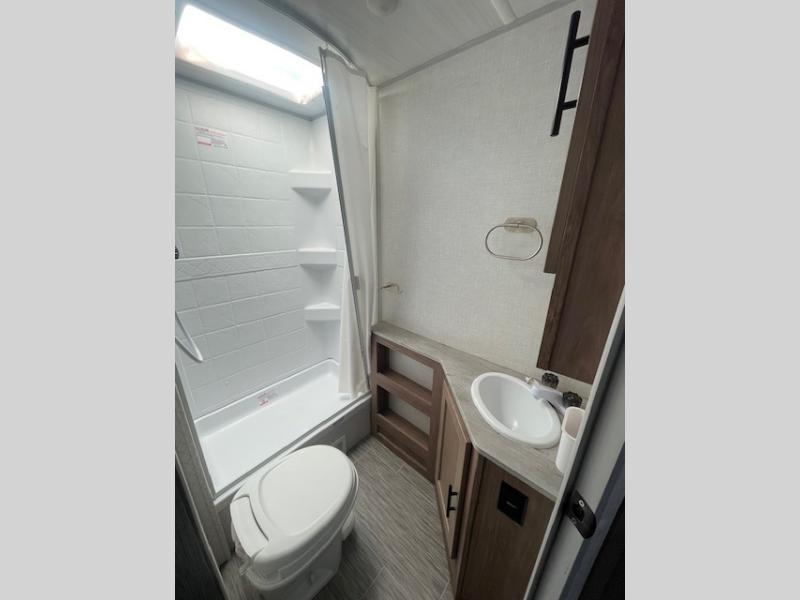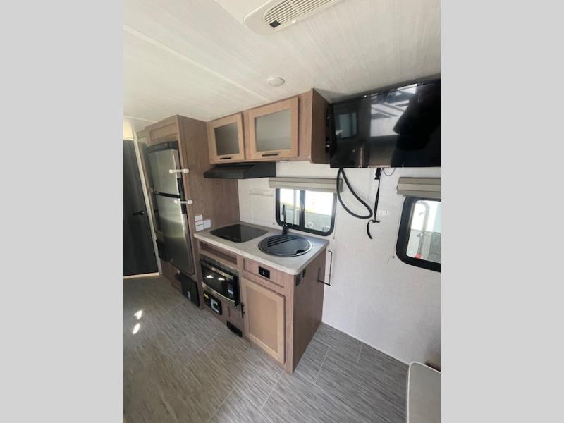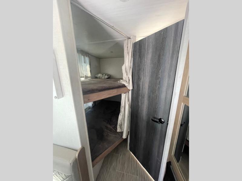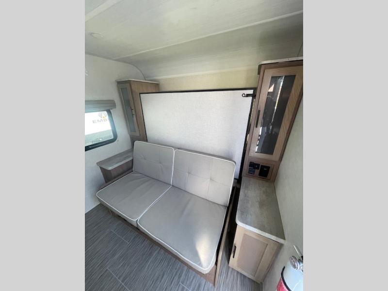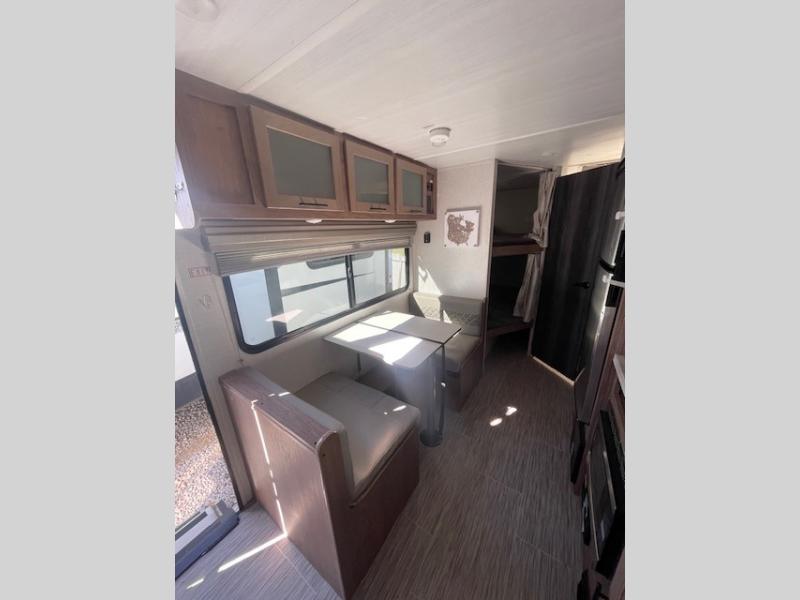 This family-friendly trailer offers sleeping space for five with the queen Murphy bed, the two bunk beds and the dinette once folded down for the evening. The cook can prepare dinner on the two-burner cooktop and easily clean up using the deep bowl sink. The refrigerator and pantry offer food storage, and you will find more places to stow clothes and camping gear throughout the inside and outside. The adventure storage door allows you to place items from the outside to the inside just under the bunks, and the pass-through compartment offers storage for fishing poles and such. Plus, the Rhino rack roof system allows you to stow your kayak and more.