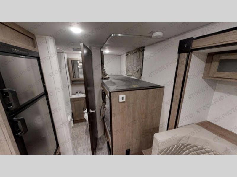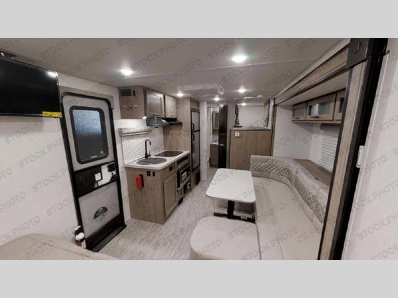 This trailer comes in under 4,000 pounds and includes a full bathroom, a slide out, bunk beds, and a 14' power awning. Now that is room for the whole family! Everyone can relax and dine inside on the chaise lounge that has a removable table, or you can choose to add the optional sofa in place of the chaise. Get cleaned up in the rear corner full bathroom which includes a closet, and find sleeping space for six total campers in this trailer. You will also find kitchen amenities to make warm meals, a USB charging station to keep the electronics up and running, a pass-through compartment along the exterior for more gear, plus a Rhino roof rack system for the fun stuff!