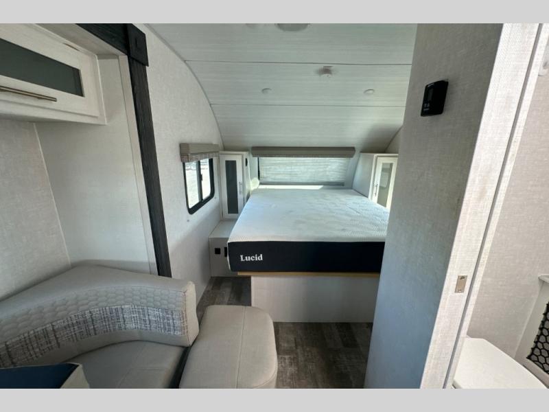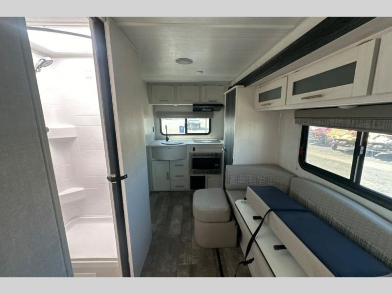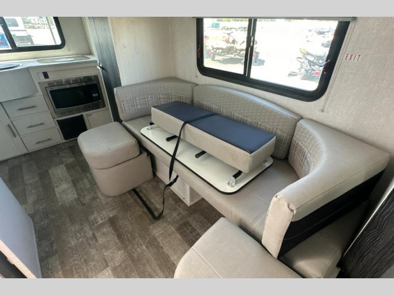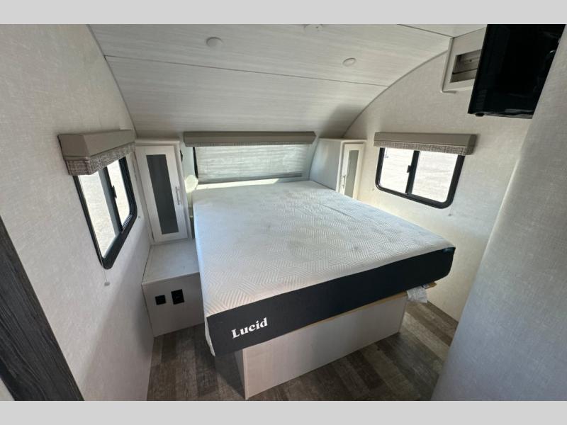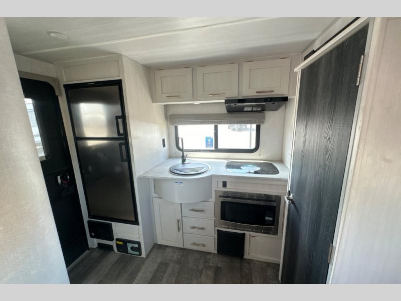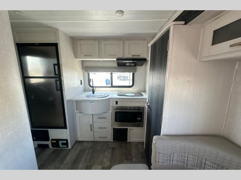 You are going to love waking up every camping weekend in this cute R-Pod travel trailer which features plenty of space and loads of storage for all of your things. The rear kitchen is unique and provides a large window above the stove top and sink so that you can feel like you are cooking right outdoors even on a day when the weather isn't perfect. The U-shaped dinette within the slide out provides more interior walking space, and it can easily be turned into an extra sleeping spot if needed. The front RV queen bed will allow you to wake refreshed for each new day of adventure, and you will appreciate the windows on each side for cross ventilation and a great view of your surroundings.