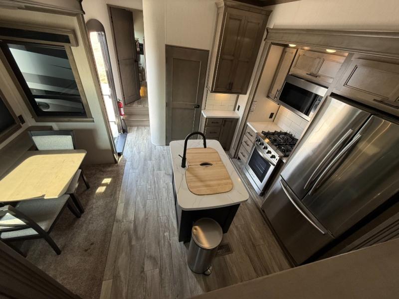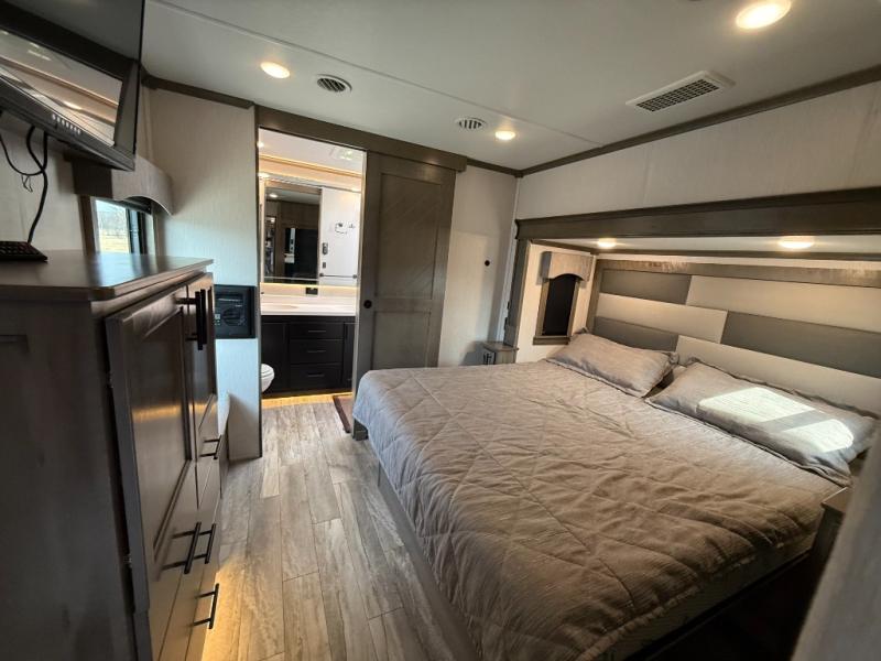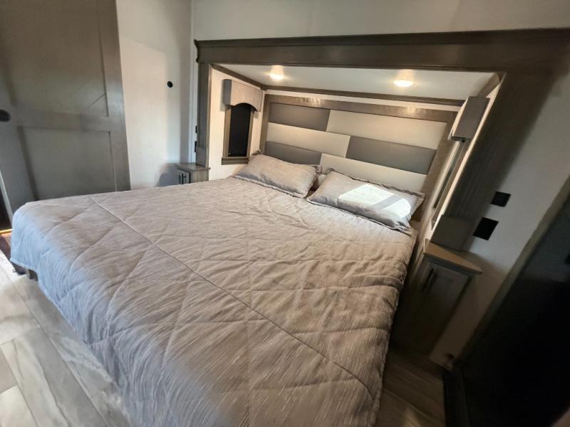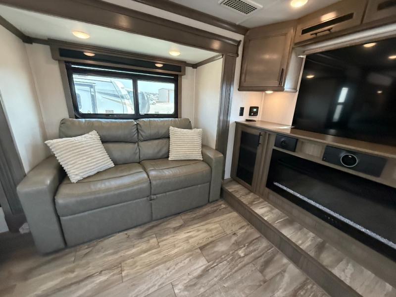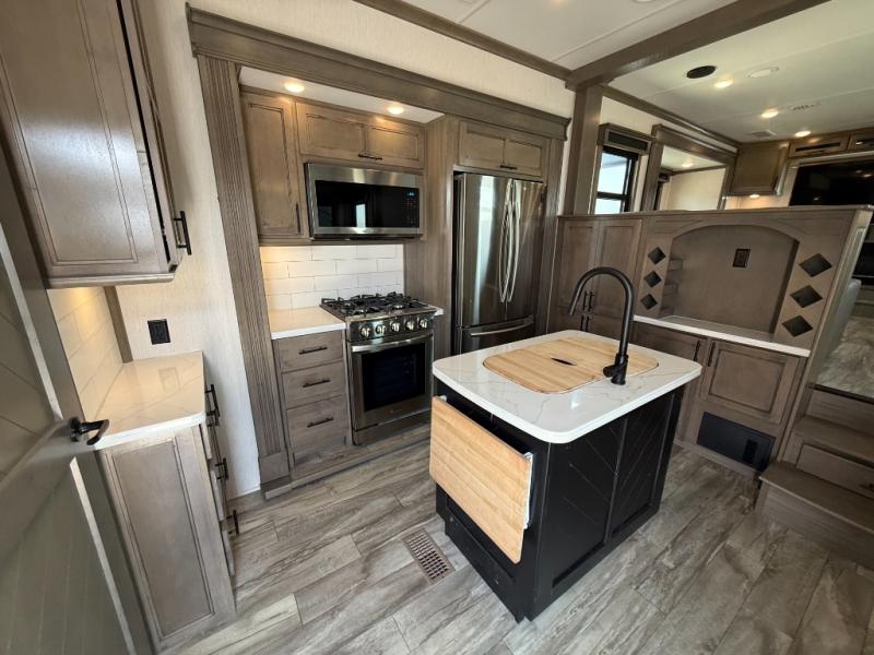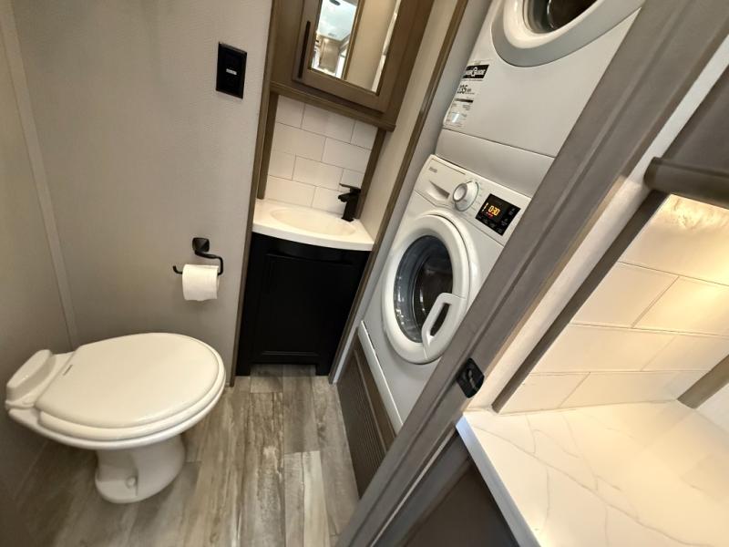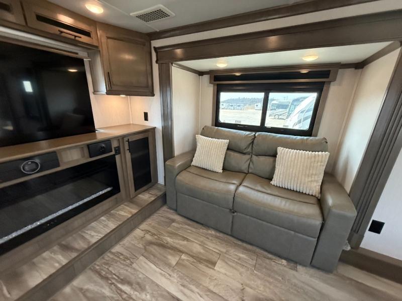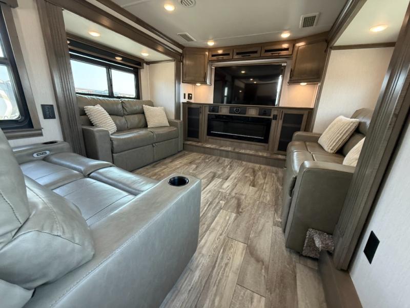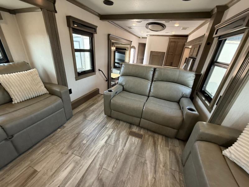 If you're looking to upgrade your travel trailer to a fifth wheel with convenient and luxurious features, look no further than this RiverStone model! The five slides found throughout will provide your crew with space to move about freely, and everyone can gather in the front living area for some family time. Here, the kids can sleep on the hide-a-bed sofas at night, and the theater seats sit directly across from the LED TV and fireplace for a great view. Whip up your best meals on the four-burner cooktop, and the kitchen island with double-bowl sink will make clean-up a breeze. You'll find the half bath right off of the kitchen, and the washer and dryer is located here too so that you can throw in a load of towels while cooking dinner. Mom and dad will love the rear master suite that includes a king bed slide, a comfy bench seat, plus a dresser with a fireplace. And don't forget about the full rear bath that includes a dual-sink vanity, a walk-in shower with a skylight, plus linen storage for clean towels!
