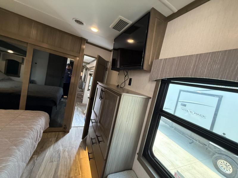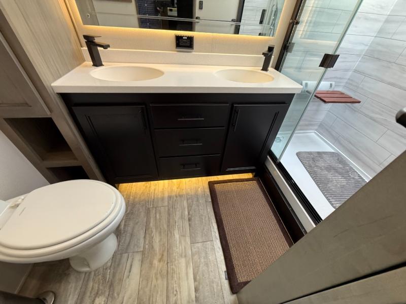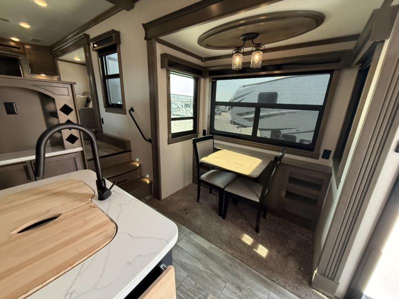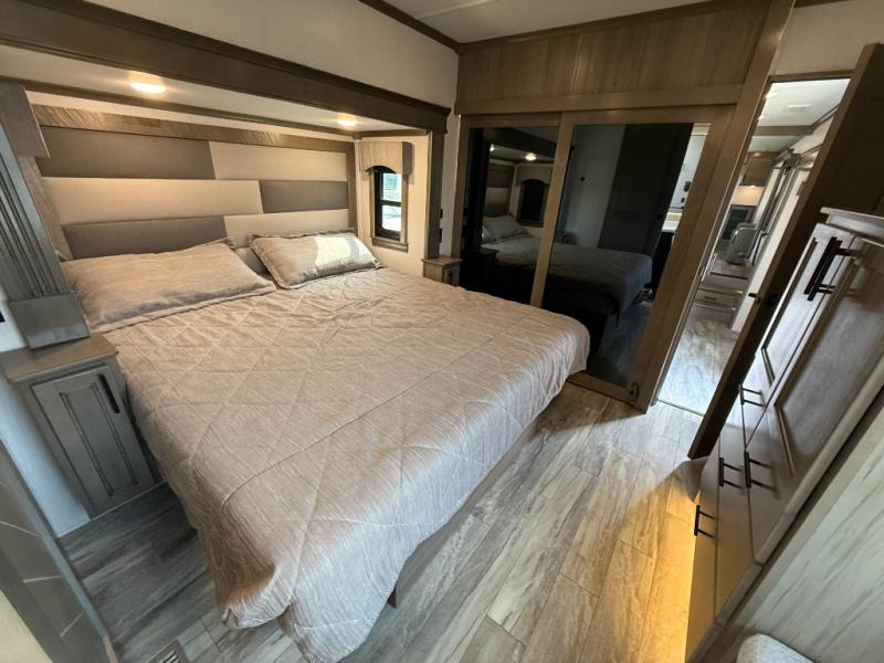With any RiverStone fifth wheel by Forest River, you will appreciate the automatic six-point hydraulic level-up system, the on-demand water heater, and the full exterior docking station to make your camping experience easier than ever. The Dexter EZ flex suspension system will provide a smooth ride on the way to the campground, and the MORryde Step Above entry steps make your coming and going easier than ever. Inside, you'll enjoy beautiful stained hardwood cabinetry and stiles throughout for a more at-home feel, a 10"-thick memory foam mattress for your comfort, plus convenient under-bed storage for your luggage, board games, and extra blankets. These models also include two 15,000 BTU high-performance quiet-cool A/Cs, a 40,000 BTU furnace, and a 5,200 BTU fireplace that will provide you with complete comfort no matter what season you're in!