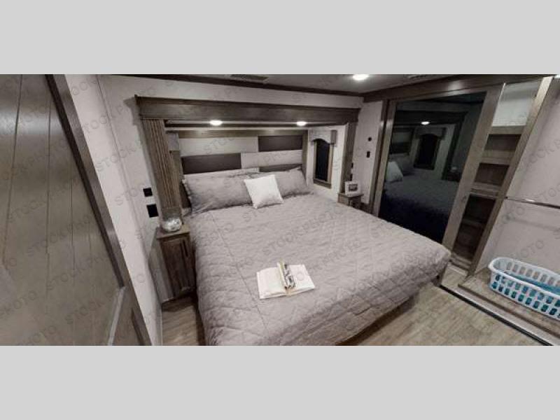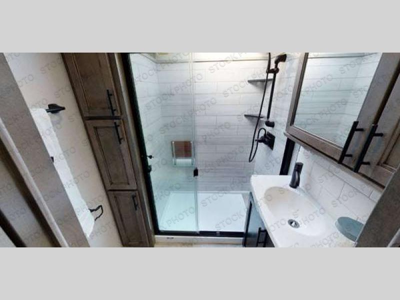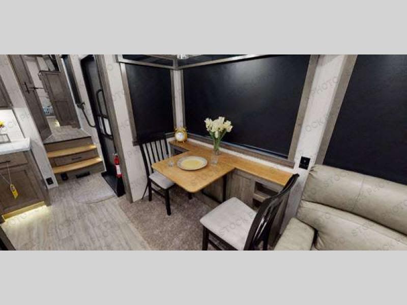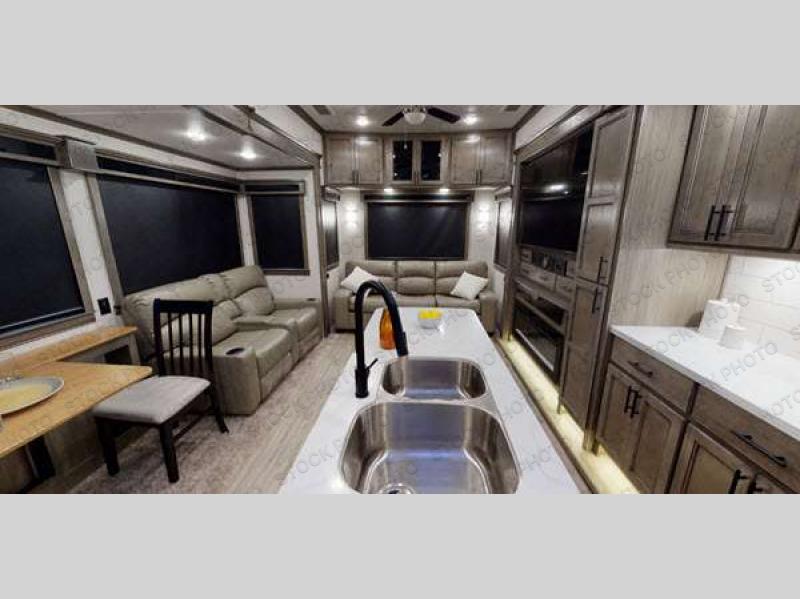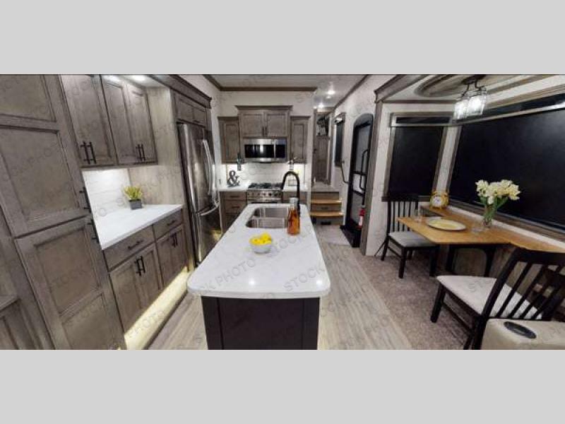 The Forest River RiverStone Reserve Series fifth wheel is an absolute dream! The construction is top notch with its wool-glass, residential-style insulation, 17.5" H-rated tires with aluminum rims, hydraulic slide outs, Dexter EZ Flex suspension system, painted full front fiberglass cap, and MORryde Step Above entry step. The RiverStone Reserve Series takes quality a step further by implementing a fully residential interior, the latest styles for interior design, and an excellent assortment of modern amenities. The central vacuum system is essential for keeping your unit clean while you are traveling, and the residential soft-close cabinet hinges are an added bonus that make your unit feel upscale. The 5,200 BTU fireplace is both functional and decorative, and the 190W solar panel, JBL Premium sound system, 1,000W inverter, and Firefly integrated touch control system are some of the great electronic features.