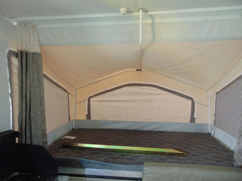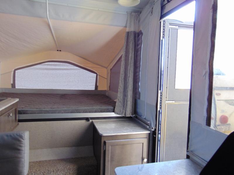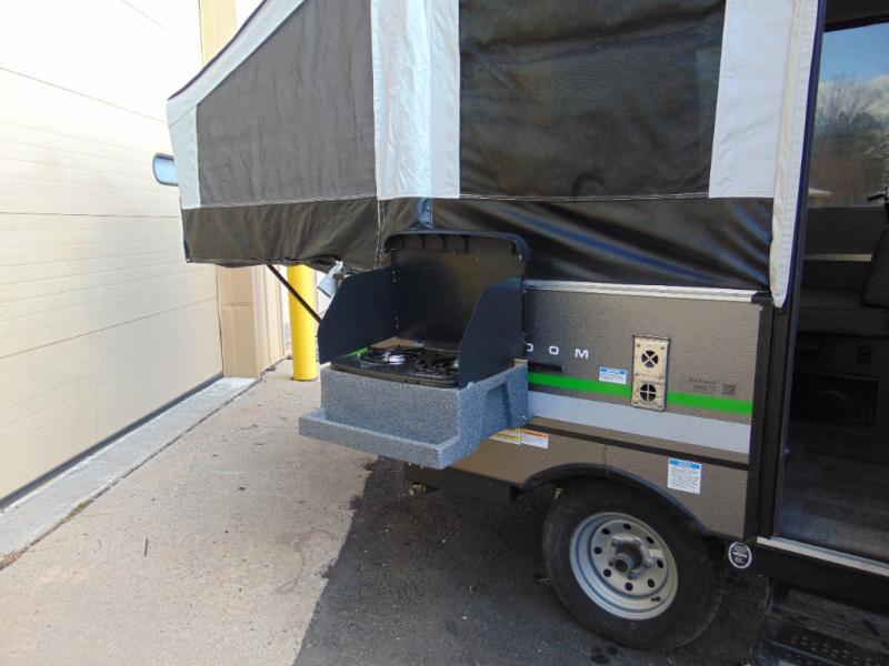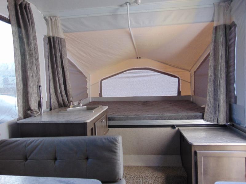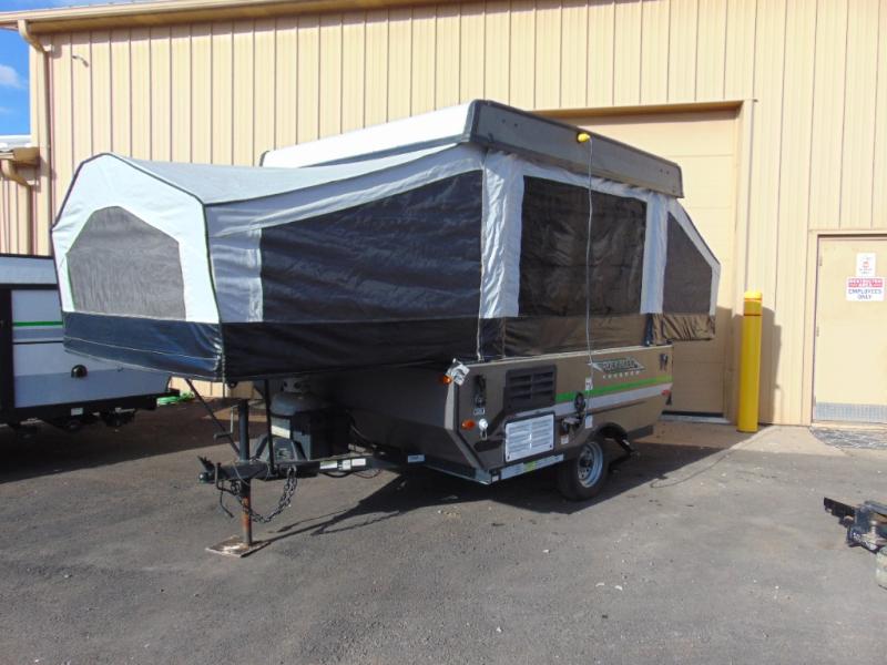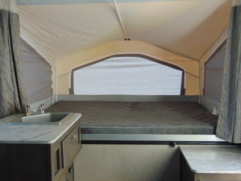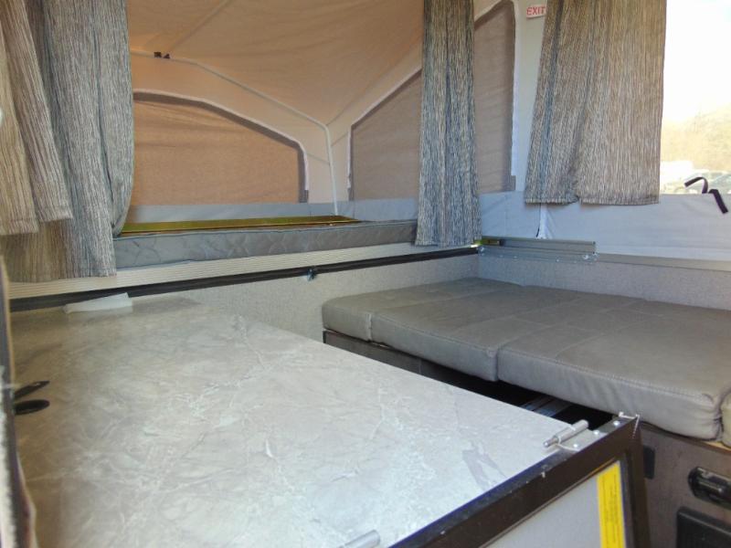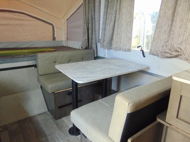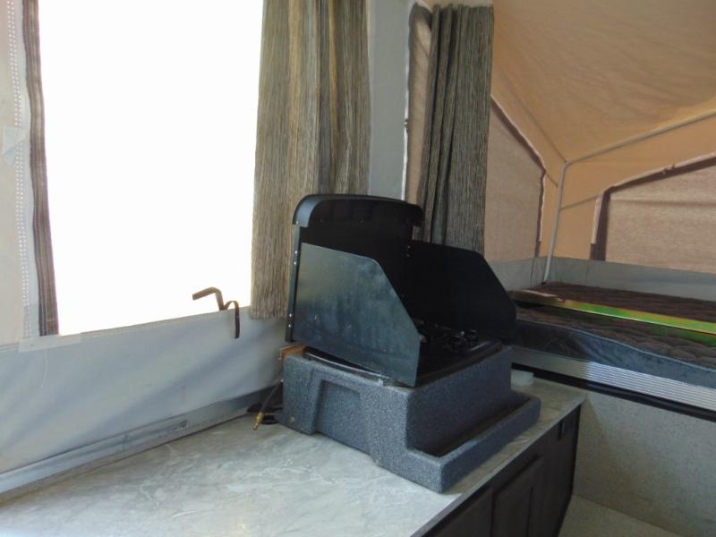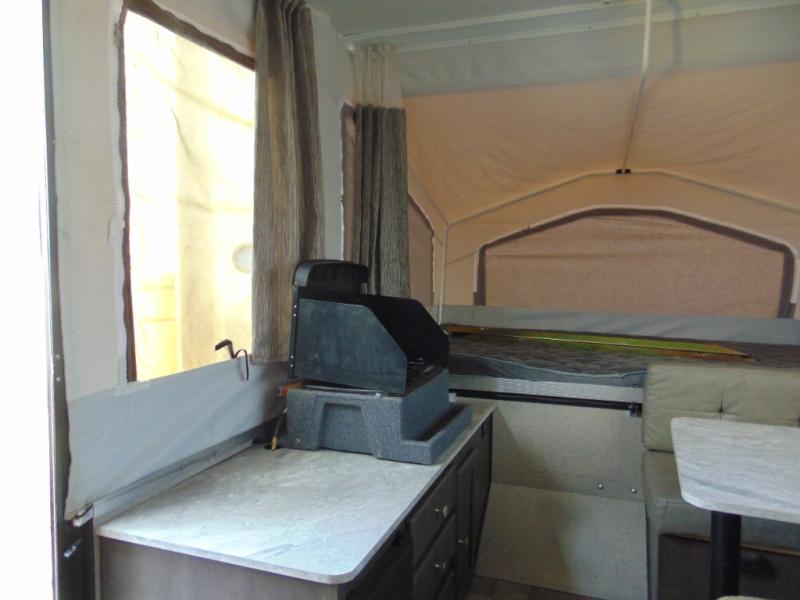 You are going to love to get together with the family of four at the campsite with this folding pop-up camper! You can use the two tent beds for sleeping at night, and the two-burner free-standing range will allow you to make a fresh batch of pancakes in the morning. Once you fold the booth dinette back into a dining area after someone sleeps here, you can sit down and enjoy your breakfast, or you can head outside to the campsite picnic table or sit underneath the 7' awning while you enjoy the sunrise.