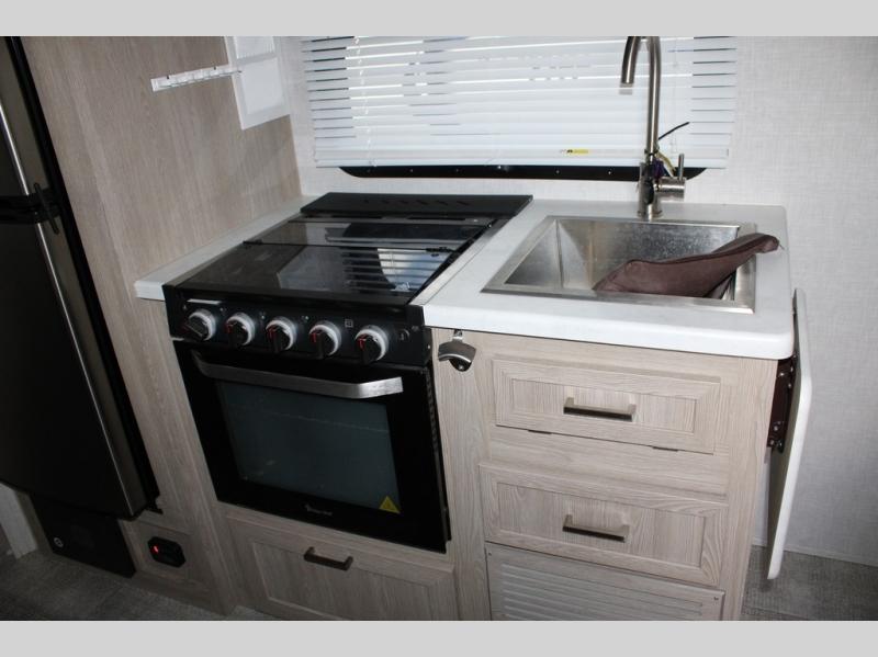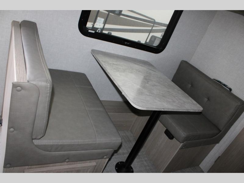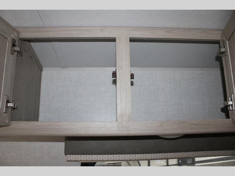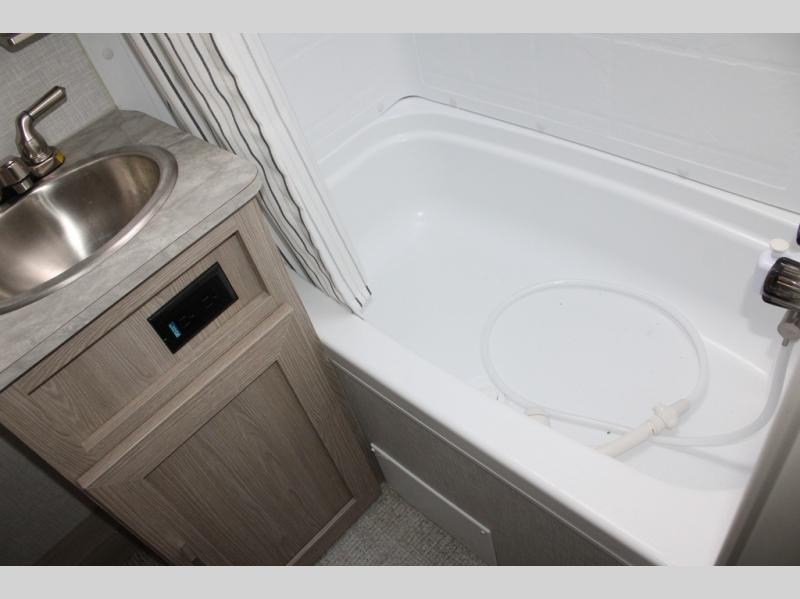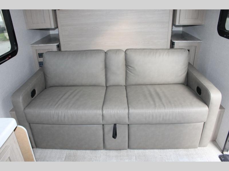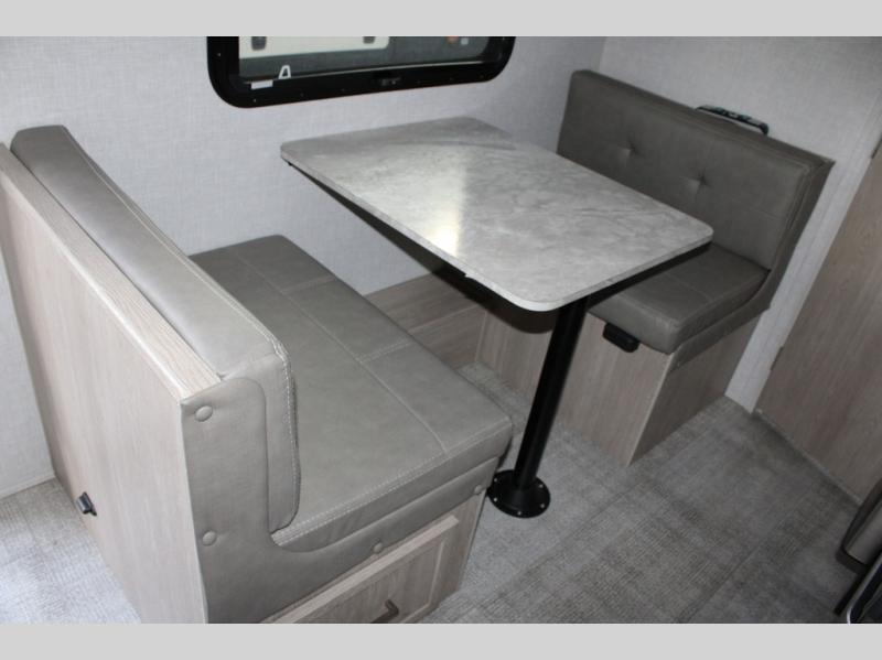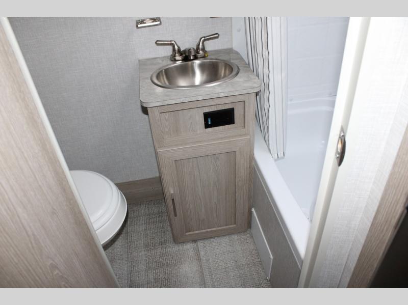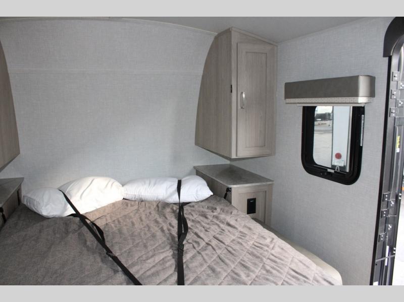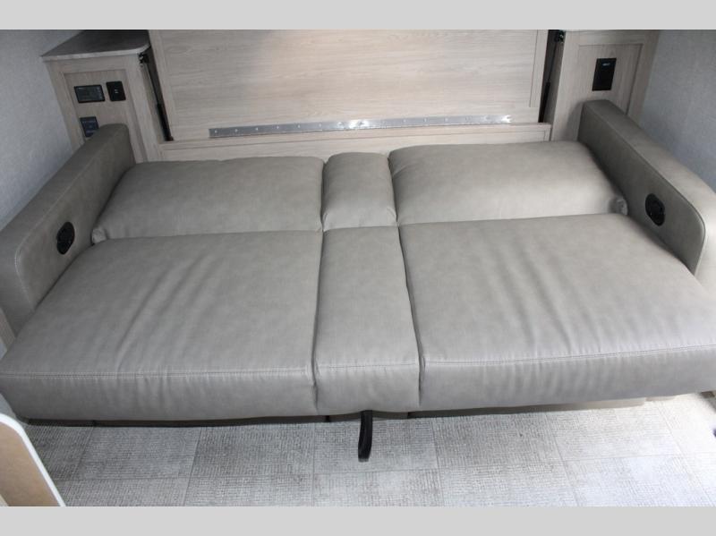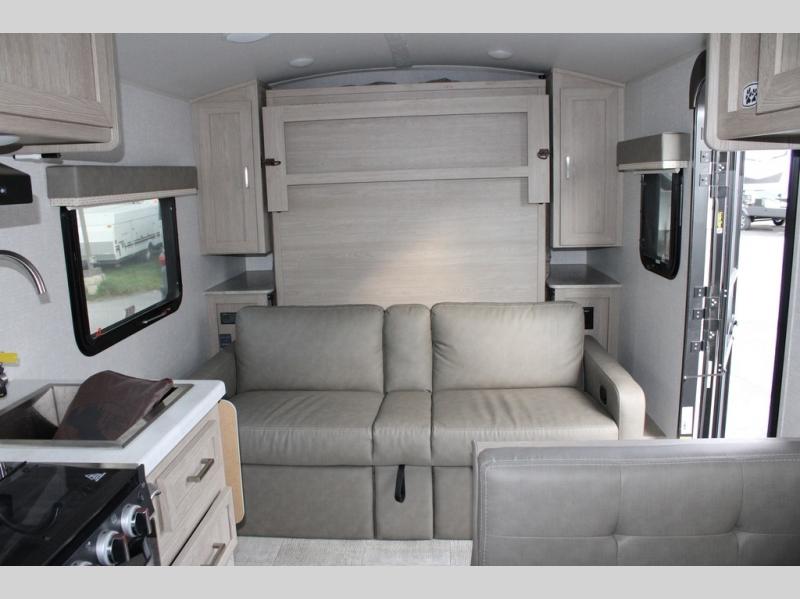 You will want this couple's travel trailer for your next weekend getaway together! It features a front Murphy bed for versatile living by providing a 54" x 74" bed to sleep on at night and a 72" sofa to sit on during the day. There are wardrobes on either side of it too so your clothes can look their best. The three burner cooktop is just waiting for you to prepare a delicious home cooked meal, and the 32" dinette welcomes you to enjoy it there comfortably, plus you can store any leftovers in the gas/electric refrigerator. The full rear bathroom has a shower for you to clean up in each morning and a linen closet to keep your towels close. There is not only a front exterior storage area, but also a pass-through storage area for all of your camping gear!