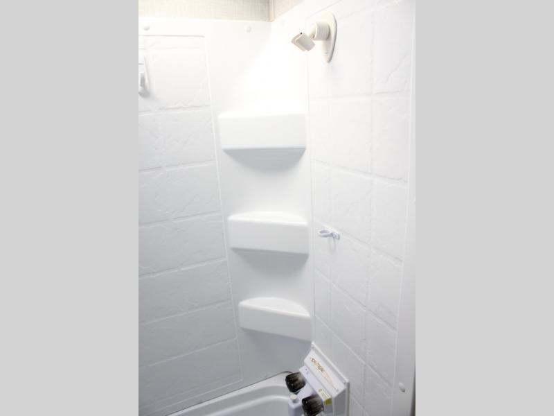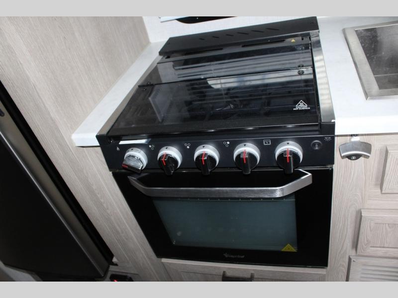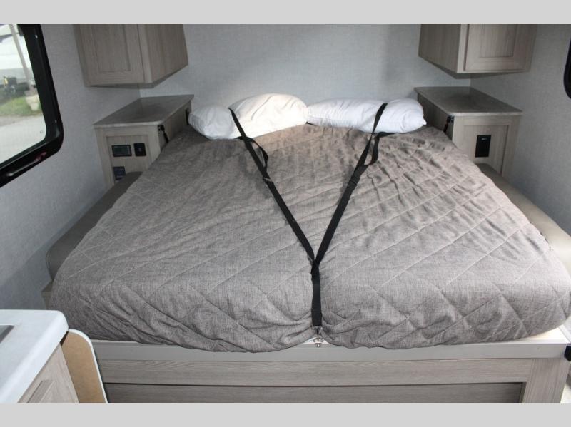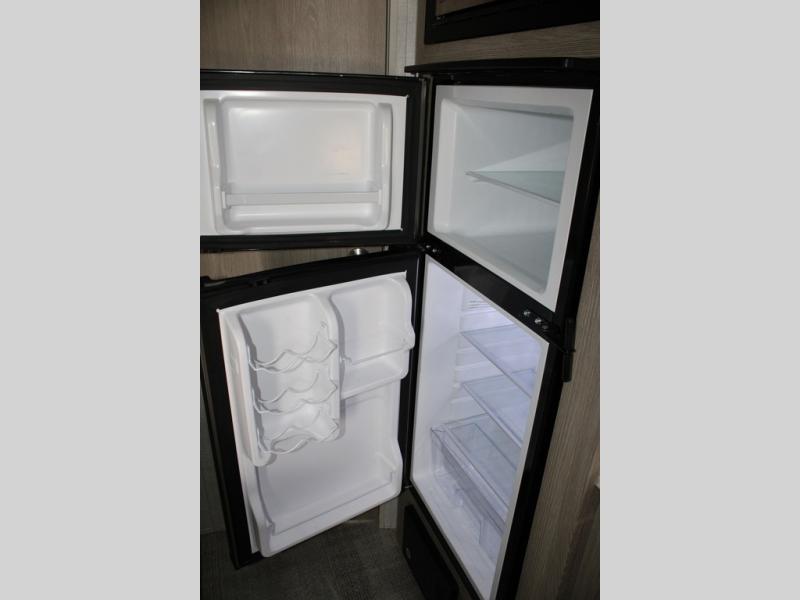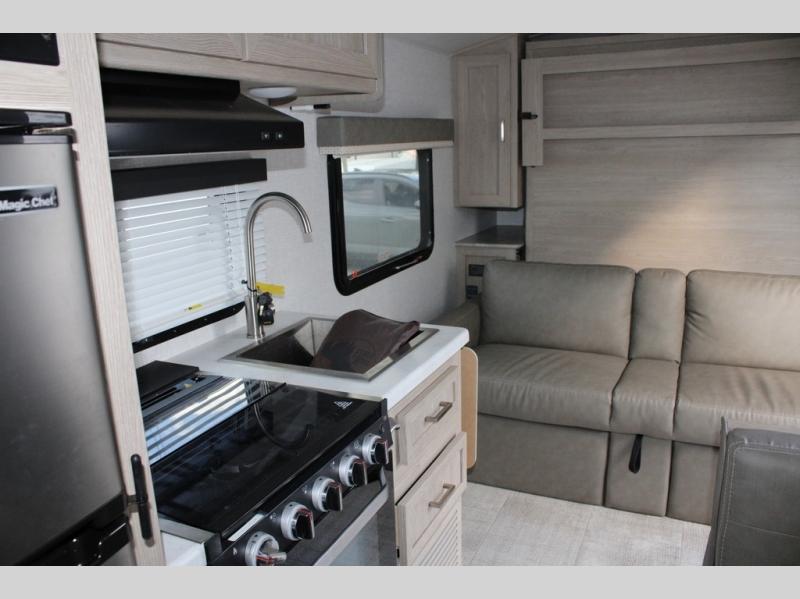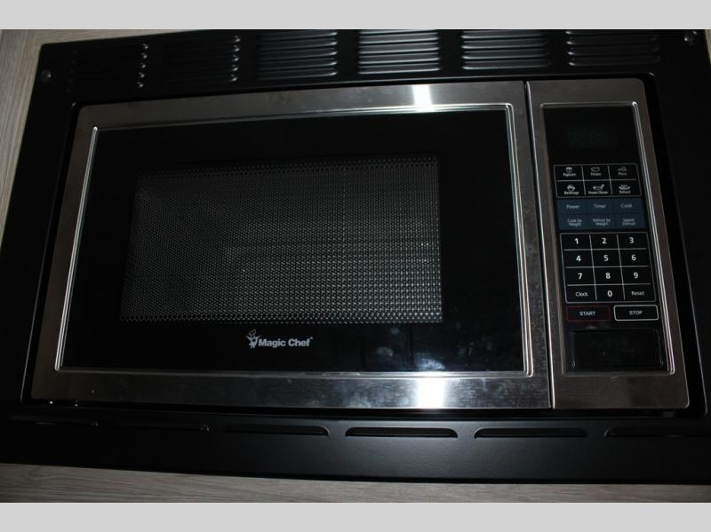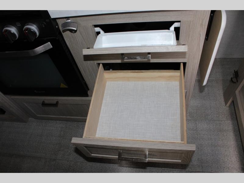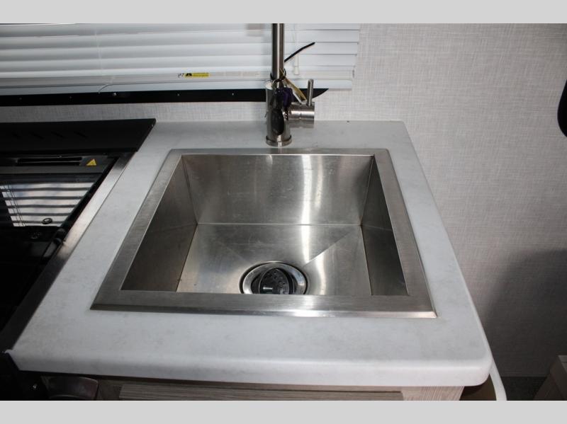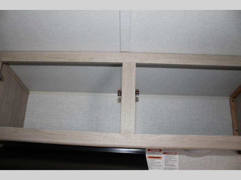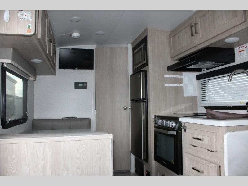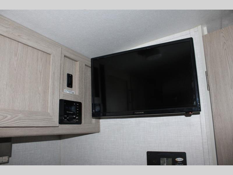 You will want this couple's travel trailer for your next weekend getaway together! It features a front Murphy bed for versatile living by providing a 54" x 74" bed to sleep on at night and a 72" sofa to sit on during the day. There are wardrobes on either side of it too so your clothes can look their best. The three burner cooktop is just waiting for you to prepare a delicious home cooked meal, and the 32" dinette welcomes you to enjoy it there comfortably, plus you can store any leftovers in the gas/electric refrigerator. The full rear bathroom has a shower for you to clean up in each morning and a linen closet to keep your towels close. There is not only a front exterior storage area, but also a pass-through storage area for all of your camping gear!