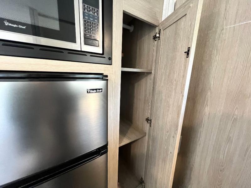 Fully equipped kitchen with refrigerator, cooktop, microwave, and pantry space