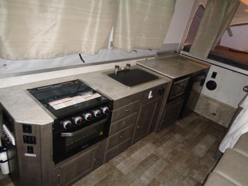 Enjoy inside comforts while sitting at the sofa with a table or the U-shaped slide out while eating or playing games before or after you explore outdoors! The cook will have a three burner cooktop, an oven and a three-way refrigerator to keep everyone fed, plus an outdoor griddle. The interior also offers a TV shelf, cabinet and counter space for your clothing and cellphones, plus a cassette toilet with a shower curtain for privacy. And you will find lots of exterior storage compartments for more gear, plus a 13' awning offering some protection from the sun.