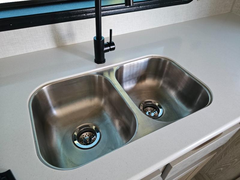 Three-burner cooktop, oven, microwave, and large stainless steel sink