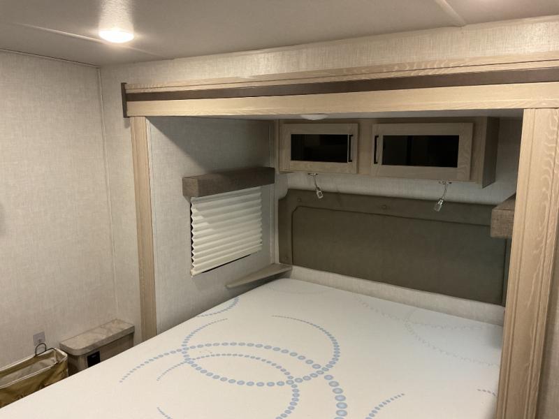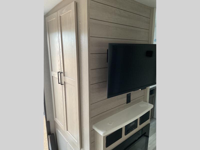 You and your spouse will love every minute spent in this travel trailer, from cooking meals in the front kitchen, relaxing on the theater seat, or sleeping on the slide out queen bed! The entertainment center and fireplace will make it feel more like home, and you'll find plenty of storage space, including a kitchen pantry and a large bedroom wardrobe for all your clothes. The walk-through bath is easily accessible, plus the bedroom includes its own exterior entry door for convenience. If you're needing more sleeping space, just choose the optional hide-a-bed sofa in place of the theater seat, or you can choose the optional free-standing table for a place to dine at.