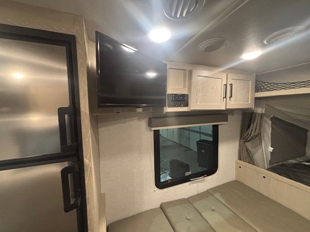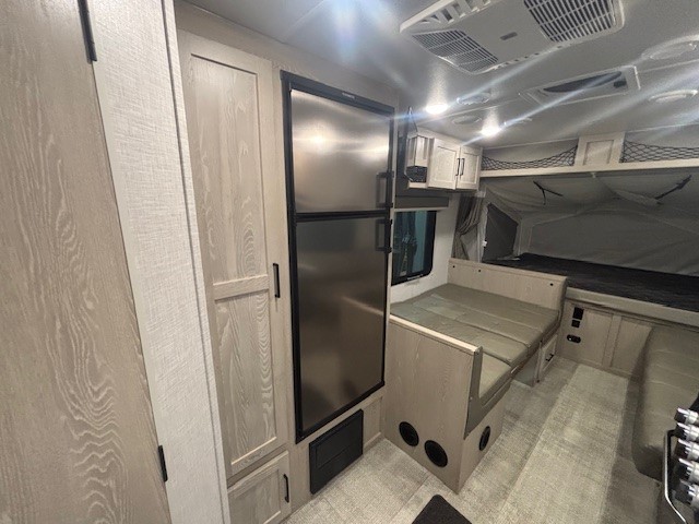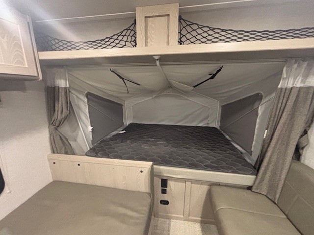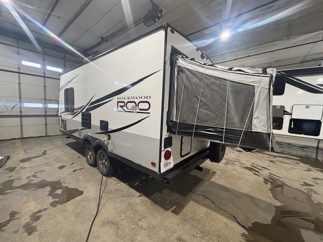 With any Rockwood Roo expandable travel trailer by Forest River you will enjoy smooth towing thanks to the torsion axle, Rubber-Ryde suspension, the easy lube axles and Nev-R-Adjust brakes, and the Goodyear Endurance tires. The key-Alike locks provide easy access in and out of your trailer, and each model includes a Teton all-in-one WiFi booster with LTE prep and an antenna for all your connection needs. Each model is constructed with a vacuum laminated one-piece roof and walls, an enclosed underbelly, and frameless windows for a more sleek look. You will enjoy many interior comforts, including hardwood cabinet doors and drawer fronts, pleated night shades, a bunk/fan light combo with each bed, and much more!
