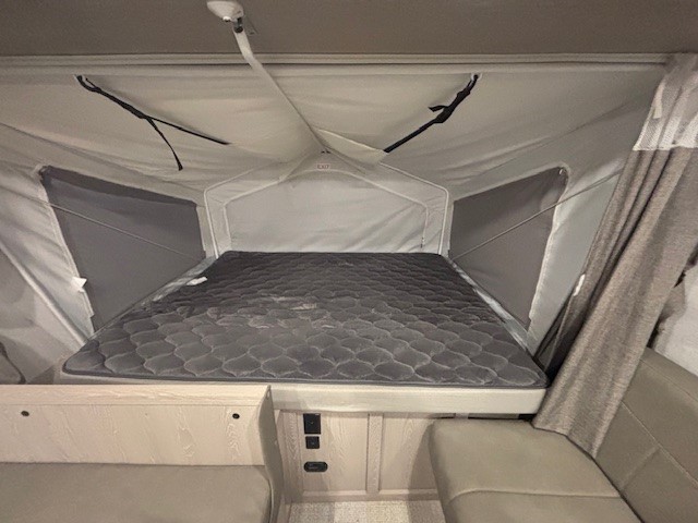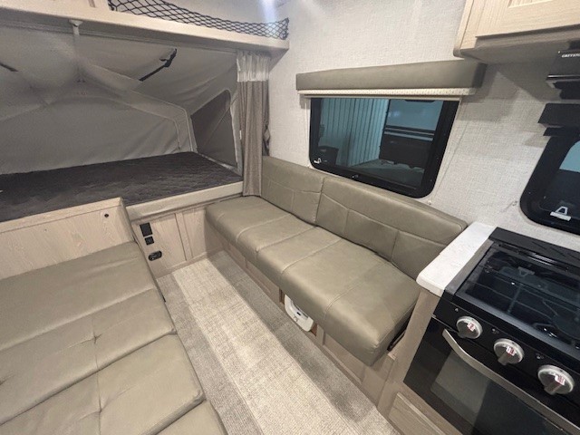 Weekend trips to the lake have never been easier than in this expandable trailer that can sleep six people each night. The two queen tent end beds will provide a comfy place to rest after traveling all day, and the kids can relax on the flip sofa or booth dinette. Prepare a quick lunch on the exterior griddle, or use the three burner gas cooktop before heading out on a trail. There is a full bath in this model which is sure to come in handy, and you'll appreciate storage space throughout for all your belongings.