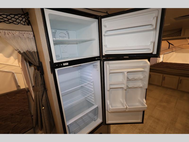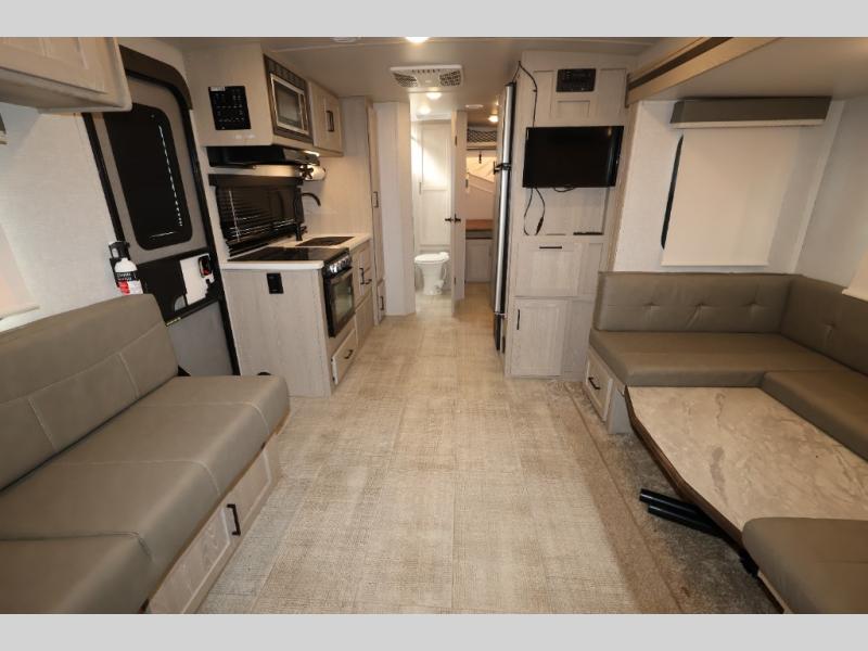Your family will love this spacious travel trailer that can sleep up to ten people each night. There are triple queen tent end beds, a U-shaped dinette, plus a flip sofa for comfortable sleeping space. The chef of the group will have a double door refrigerator and a pantry to store all the food, plus there is an exterior griddle for breakfast outside. This model also includes convenient exterior storage for fishing poles, tackle boxes, and your luggage!