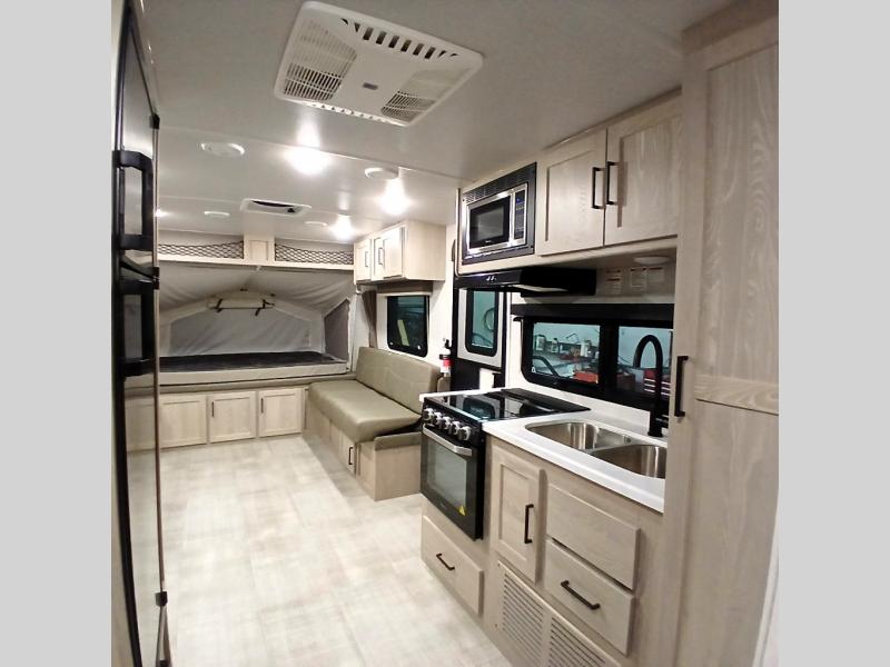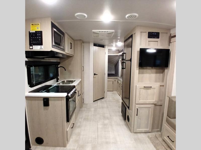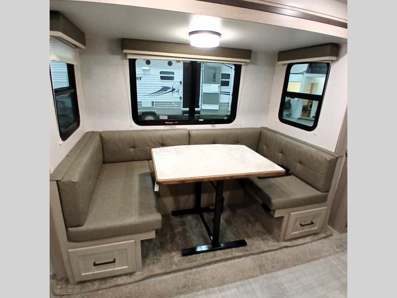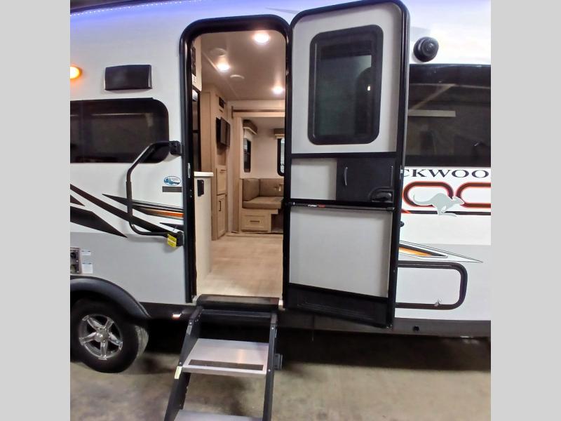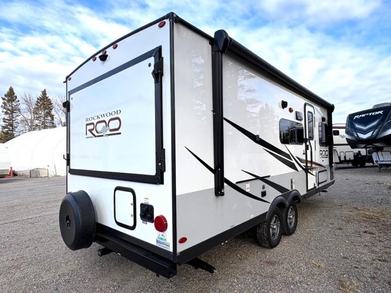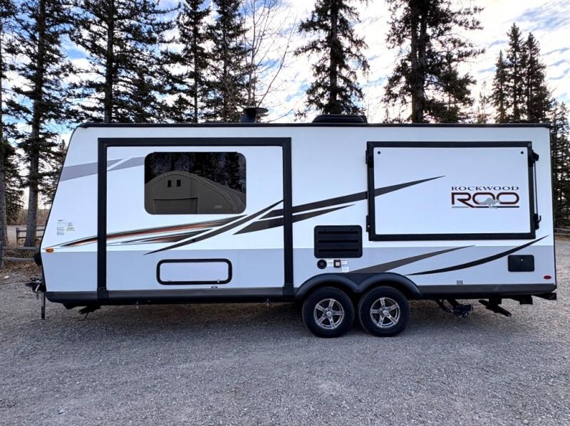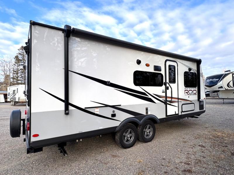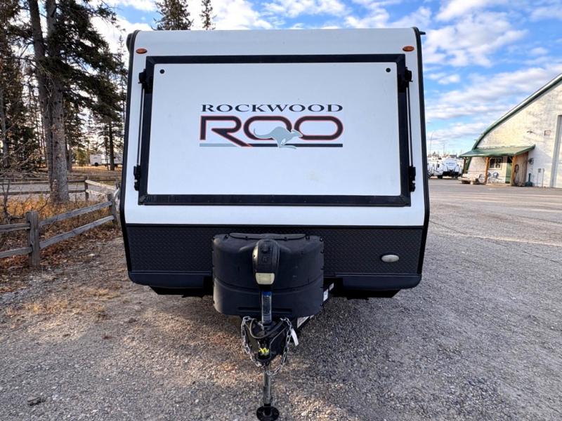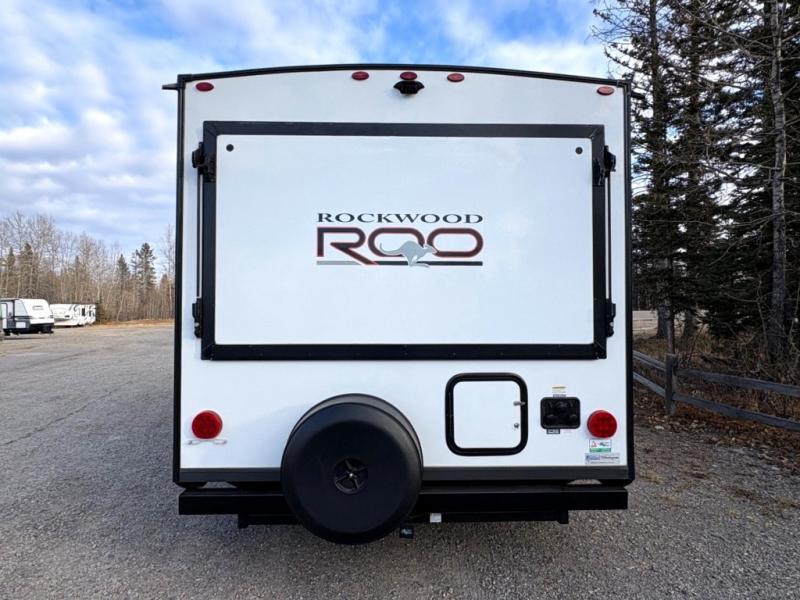 With any Rockwood Roo expandable travel trailer by Forest River you will enjoy smooth towing thanks to the torsion axle, Rubber-Ryde suspension, the easy lube axles and Nev-R-Adjust brakes, and the Goodyear Endurance tires. The key-Alike locks provide easy access in and out of your trailer, and each model includes a Teton all-in-one WiFi booster with LTE prep and an antenna for all your connection needs. Each model is constructed with a vacuum laminated one-piece roof and walls, an enclosed underbelly, and frameless windows for a more sleek look. You will enjoy many interior comforts, including hardwood cabinet doors and drawer fronts, pleated night shades, a bunk/fan light combo with each bed, and much more!