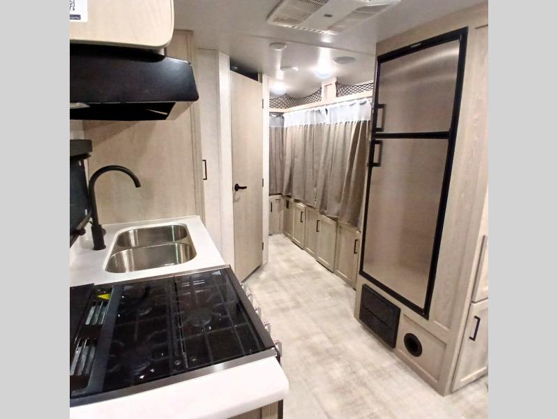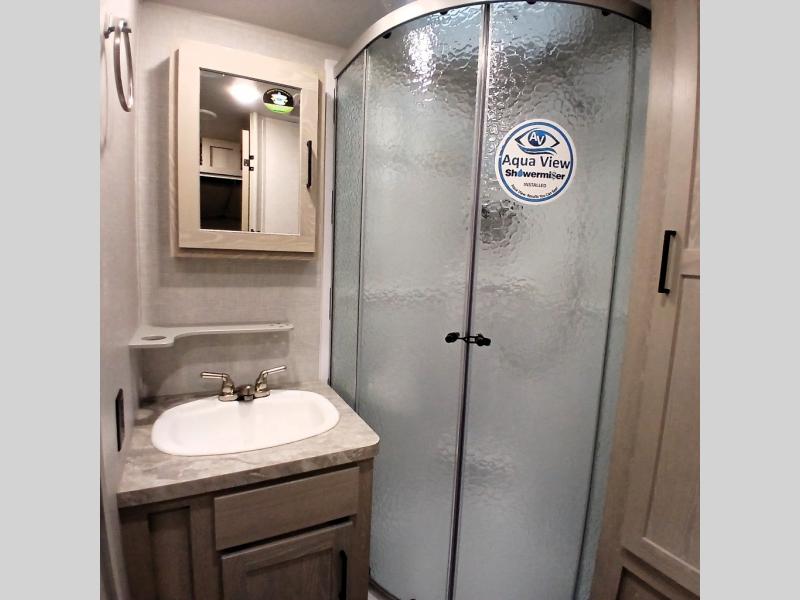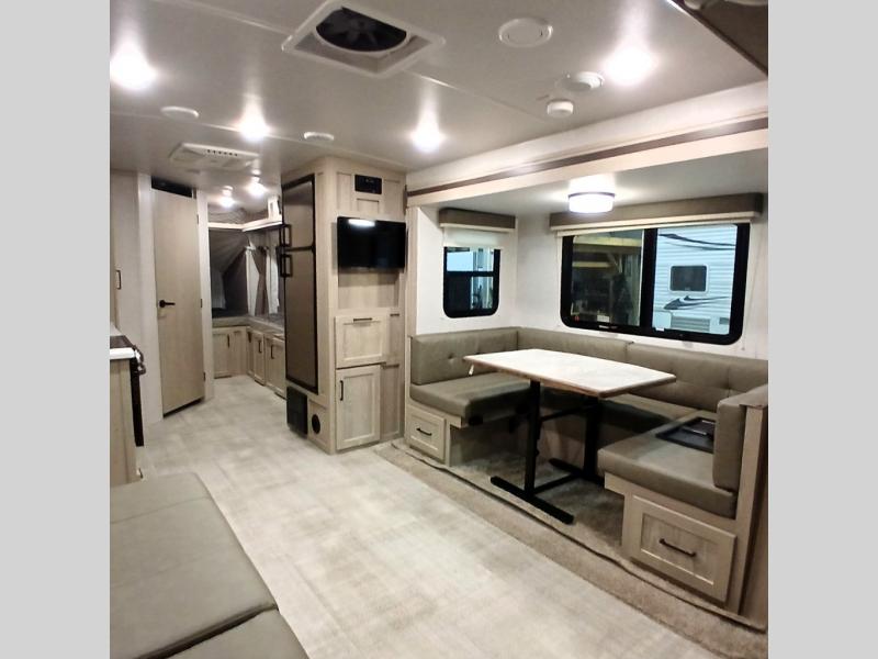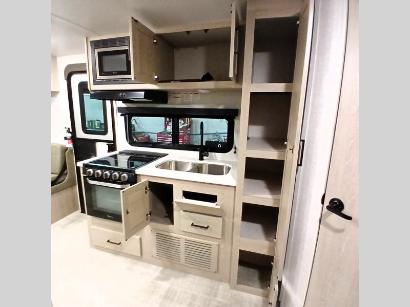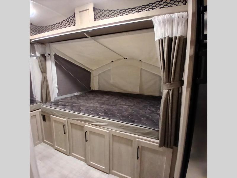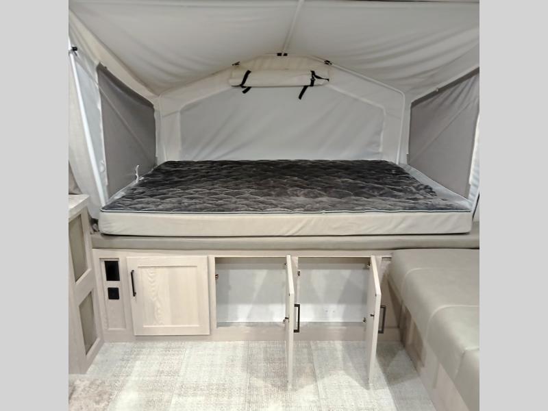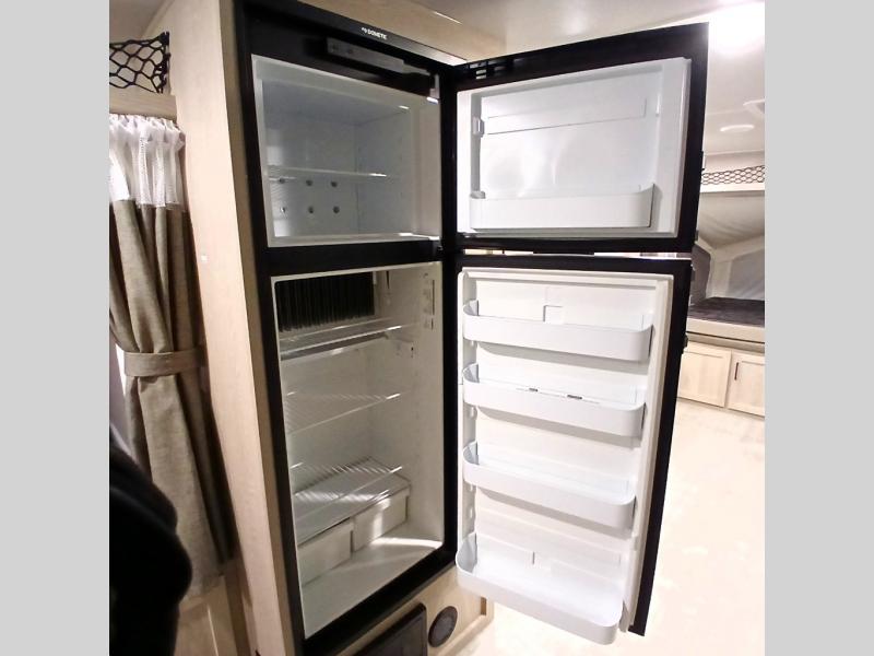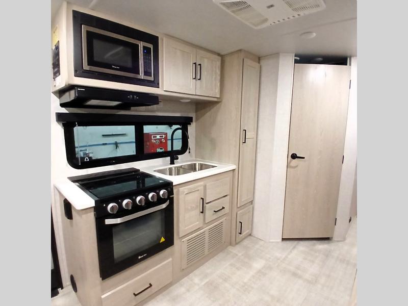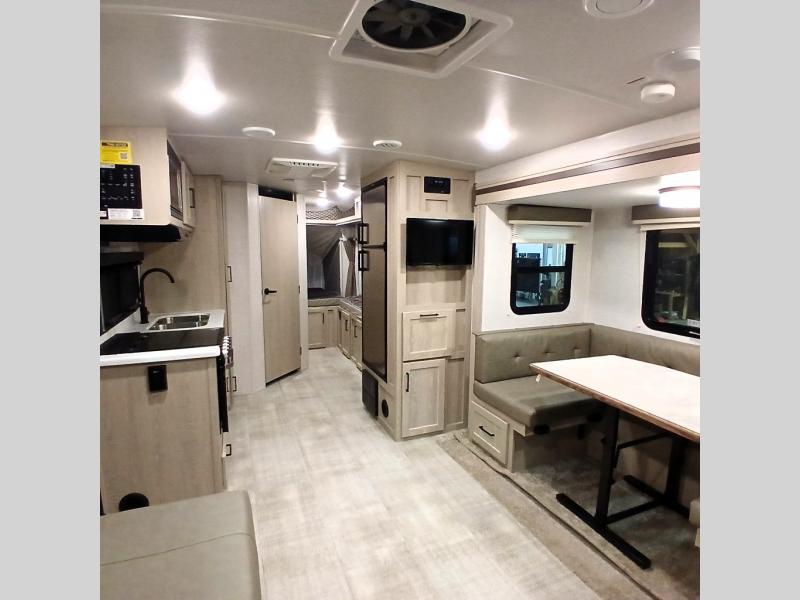 With any Rockwood Roo expandable travel trailer by Forest River you will enjoy smooth towing thanks to the torsion axle, Rubber-Ryde suspension, the easy lube axles and Nev-R-Adjust brakes, and the Goodyear Endurance tires. The key-Alike locks provide easy access in and out of your trailer, and each model includes a Teton all-in-one WiFi booster with LTE prep and an antenna for all your connection needs. Each model is constructed with a vacuum laminated one-piece roof and walls, an enclosed underbelly, and frameless windows for a more sleek look. You will enjoy many interior comforts, including hardwood cabinet doors and drawer fronts, pleated night shades, a bunk/fan light combo with each bed, and much more!