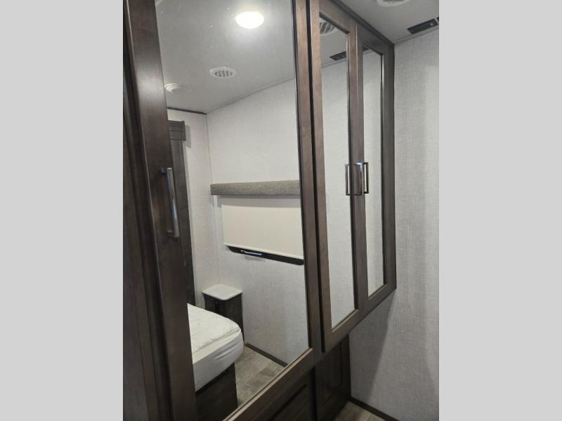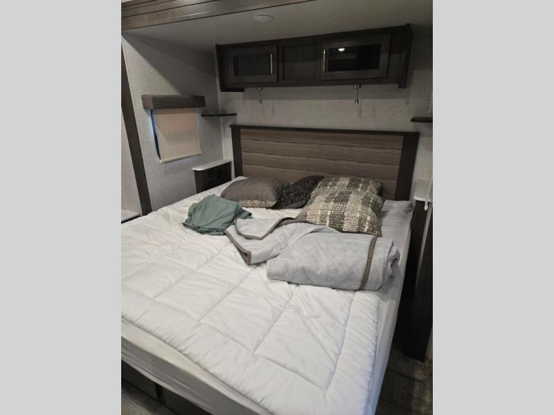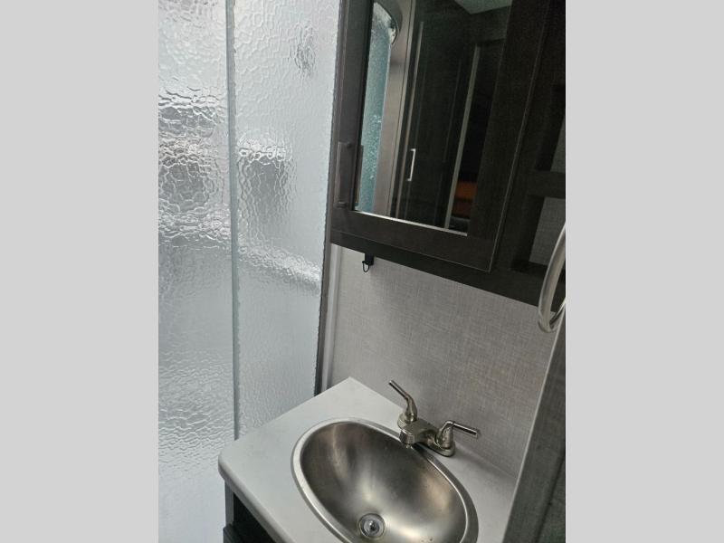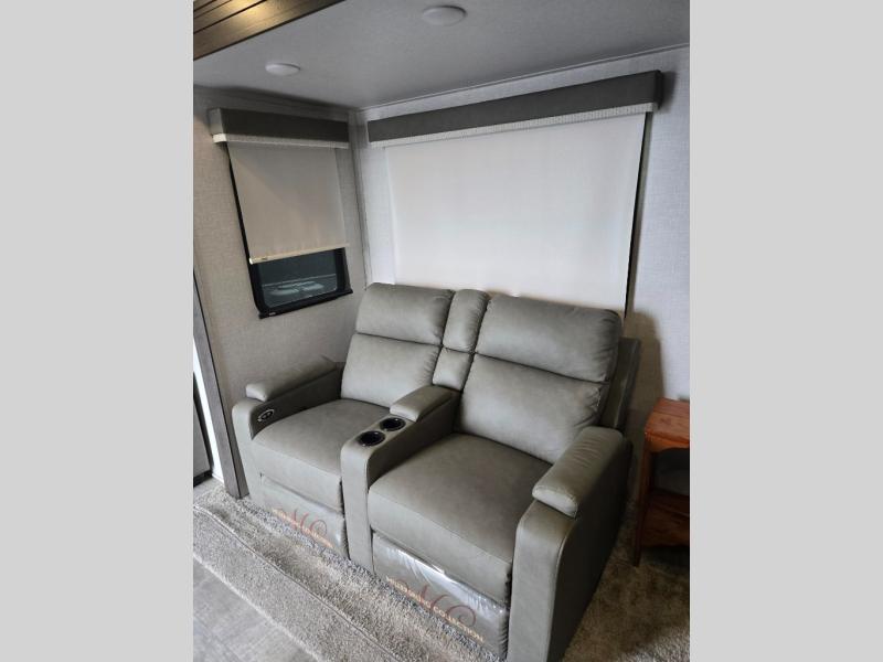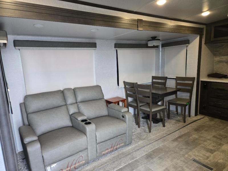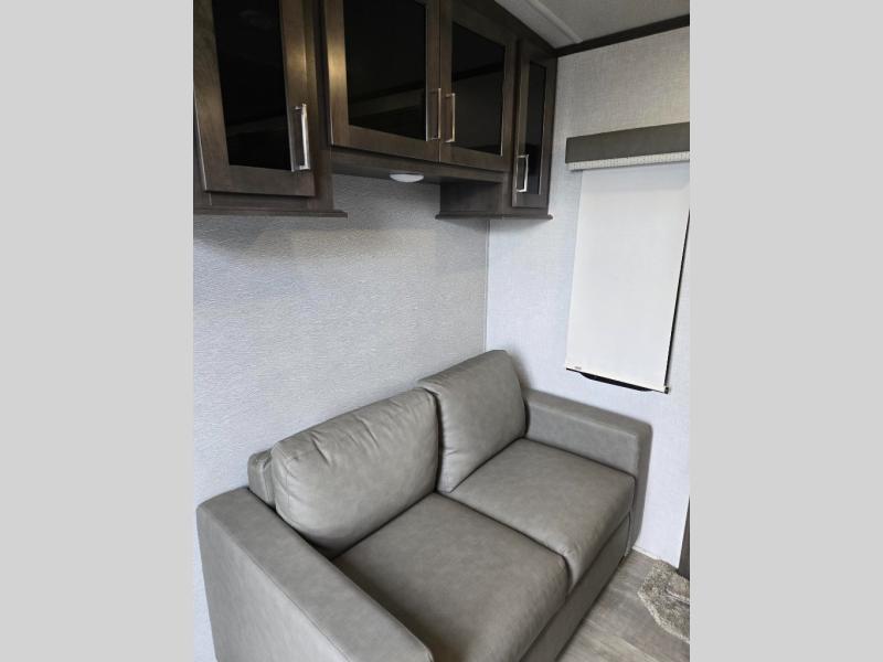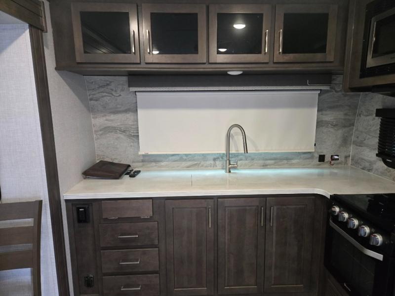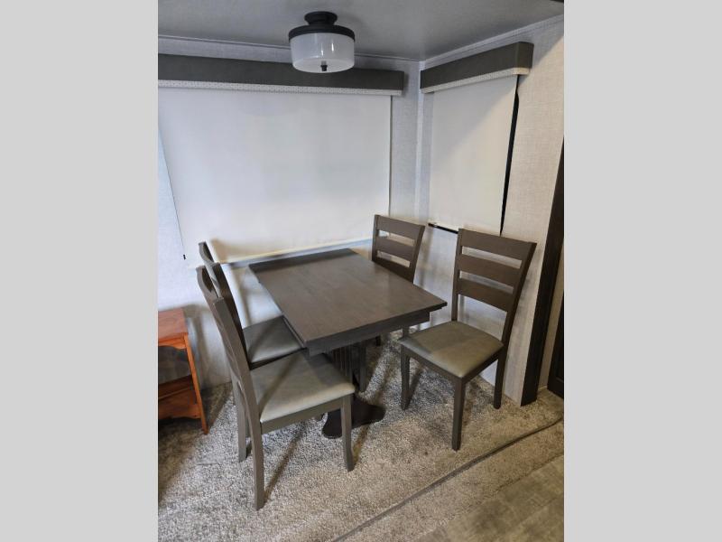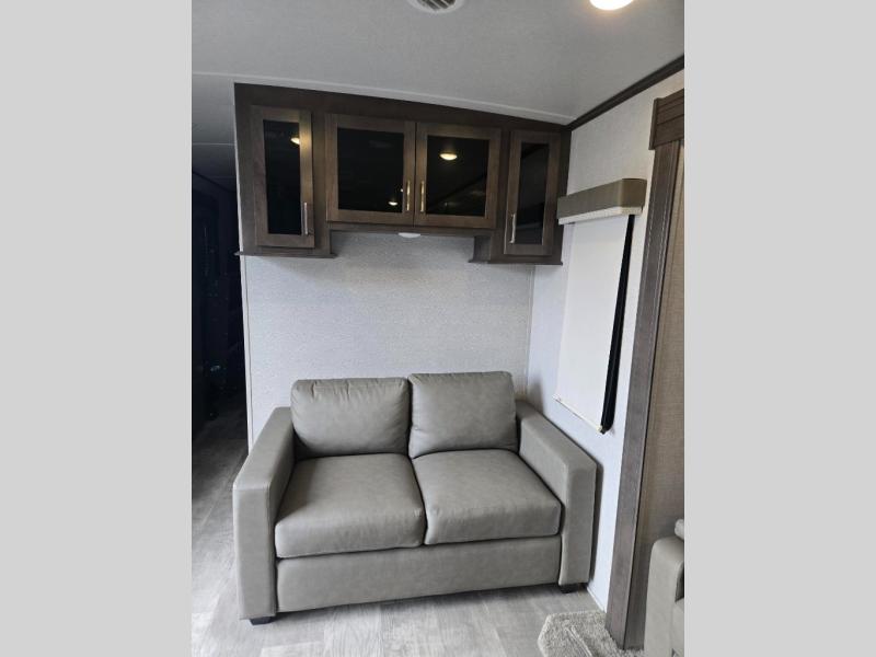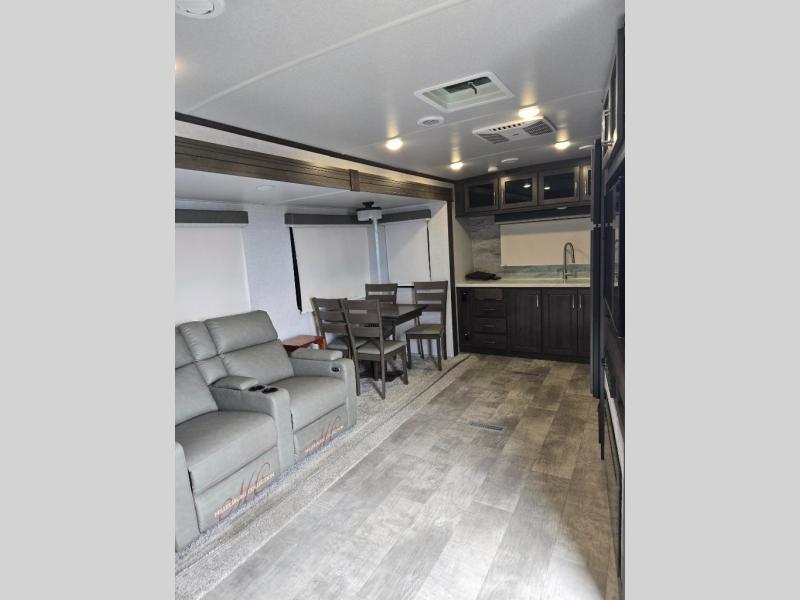 This travel trailer with a front kitchen layout is sure to bring you years of memories camping with family. The large slide out in the main living area is where the kids can enjoy their breakfast at the booth dinette, and you relax on the theater seat with your coffee. After a day at the lake everyone can freshen up in the dual entry bath before heading outside to sit under the 21' power awning with LED lights. Your guests can sleep on the hide-a-bed sofa and booth dinette, while you and your spouse enjoy the king bed slide out in the rear private suite. It's a win-win for everyone in this travel trailer!