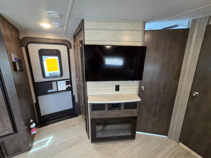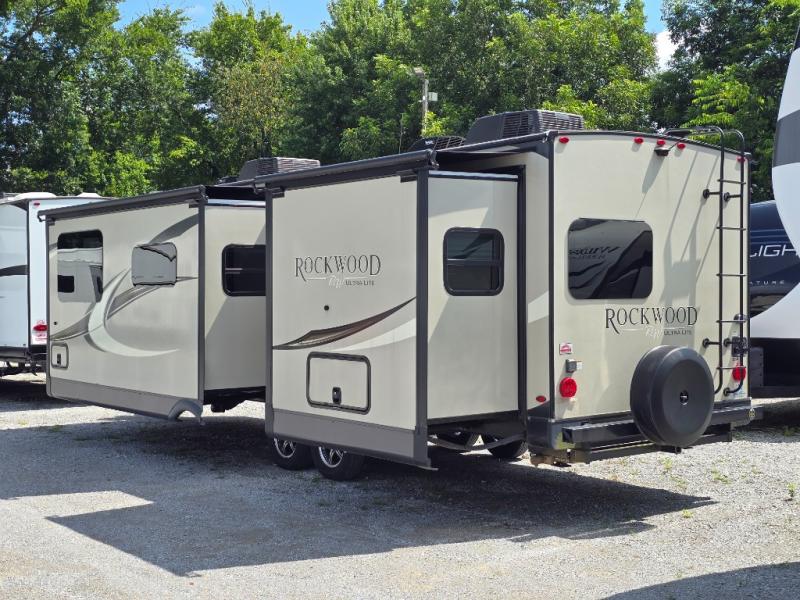 Step inside this Forest River Rockwood Ultra Lite travel trailer and experience camping like never before! It features a rear private bedroom with a queen-size bed, nightstands on either side, and plenty of wardrobe space so that you can be dressed for any occasion, plus you can add the optional TV for those late nights when you just can't fall asleep. With the double entry doors, this unit provides a smooth flow of traffic both in and out. The best way to wind down your night is by grabbing a drink and lying back on the 67" hide-a-bed sofa in front of the cozy fireplace. If you want to experience the great outdoors to its fullest though, then grab a chair and sit back underneath the 21' power awning with an LED light strip!