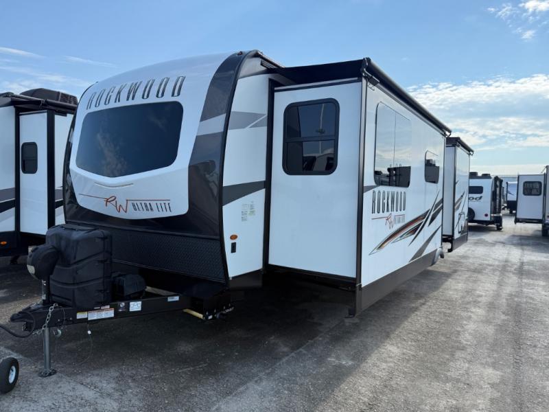 Step inside this Forest River Rockwood Ultra Lite travel trailer and experience camping like never before! It features a rear private bedroom with a queen-size bed, nightstands on either side, and plenty of wardrobe space so that you can be dressed for any occasion, plus you can add the optional TV for those late nights when you just can't fall asleep. With the double entry doors, this unit provides a smooth flow of traffic both in and out. The best way to wind down your night is by grabbing a drink and lying back on the 67" hide-a-bed sofa in front of the cozy fireplace. If you want to experience the great outdoors to its fullest though, then grab a chair and sit back underneath the 21' power awning with an LED light strip!