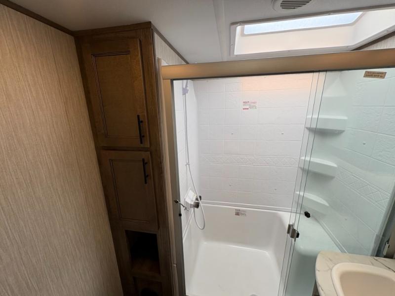 - Roomy living space: Mid-living slide houses theater seating and dinette under central skylight