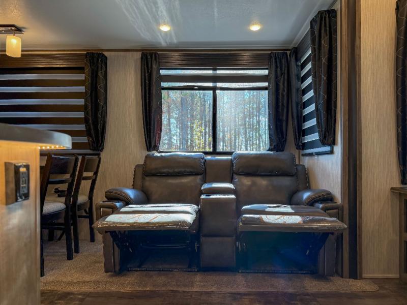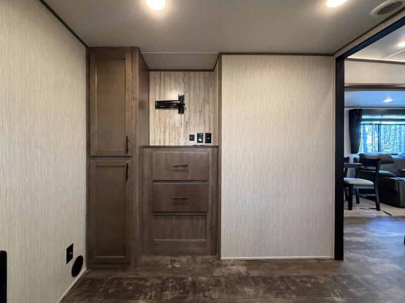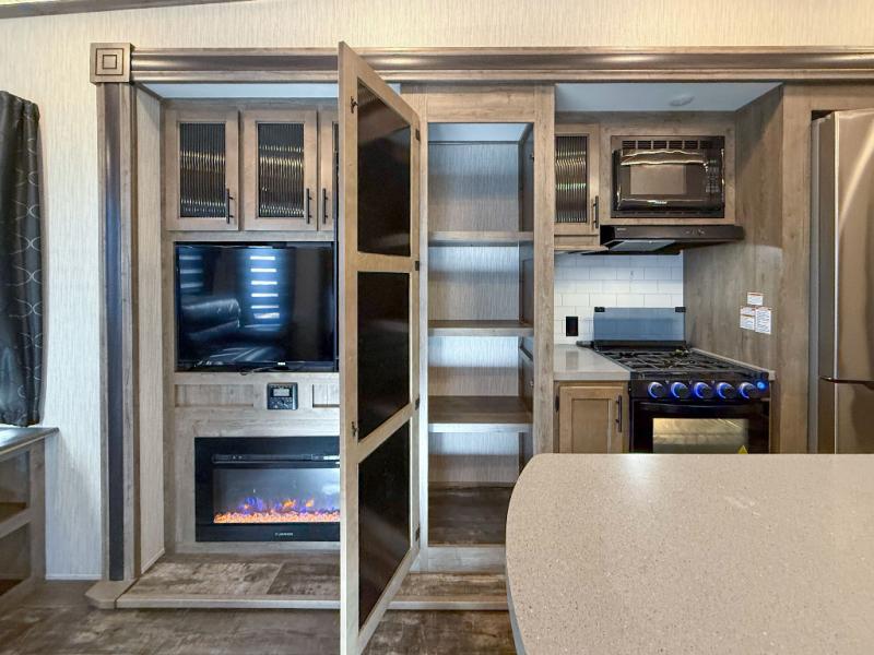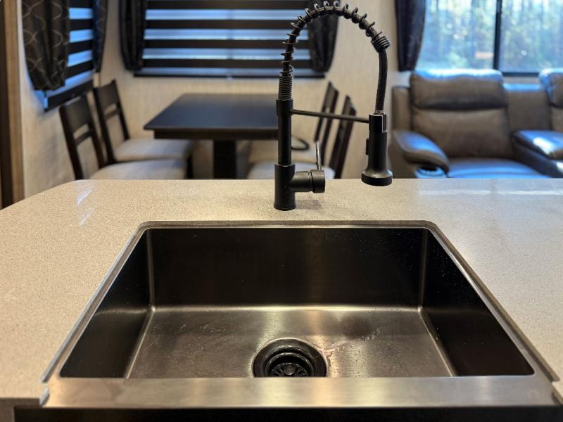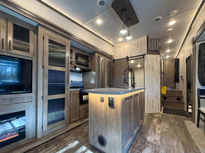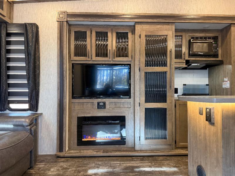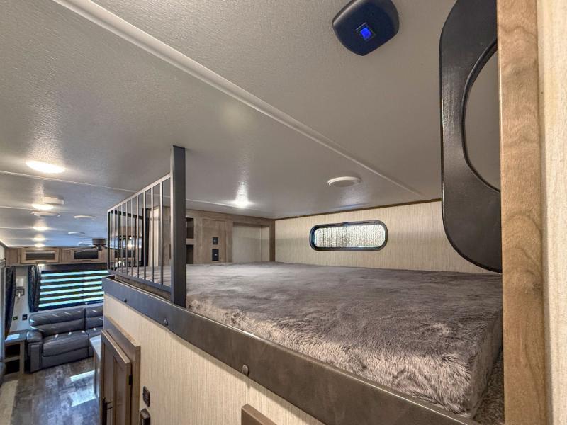 There's something for everyone in this Sabre fifth wheel! The front private bedroom includes a queen bed that can be replaced for an optional king bed and a front closet with an area prepped for the optional washer and dryer. Your guests will feel right at home in the second bedroom with a jack knife sofa, plus a closet, dresser, and wardrobe for their clothes. There is even a loft above this room for the kids. The kitchen island not only provides extra counter and storage space, but is also makes cleaning up even easier with the farm-style sink and deluxe pull-down faucet. After you have spent a fun day in the sun, head to the rear living area and relax on either the tri-fold sofa which can be transformed into an extra sleeping space or on the home theatre seating with heat and massage. As you sit back and relax, you'll find a fireplace directly across with a large residential TV above it for you to watch your favorite movie!