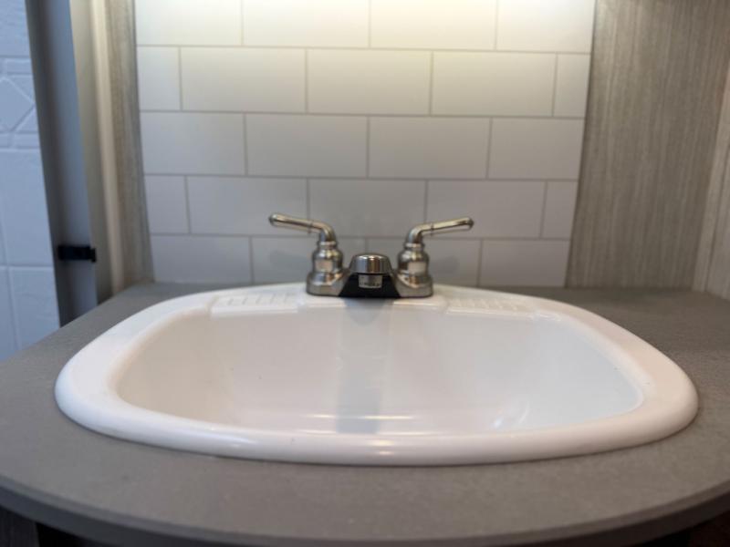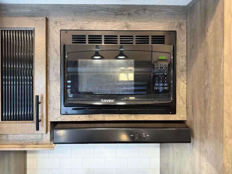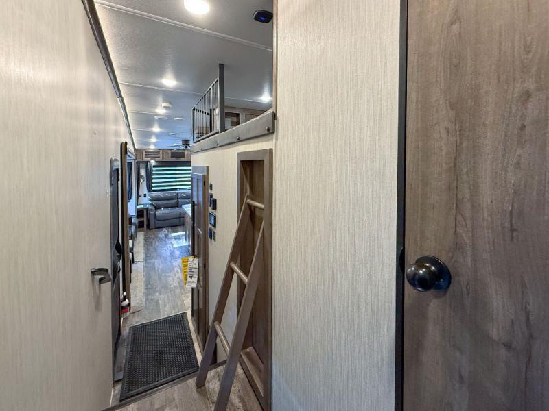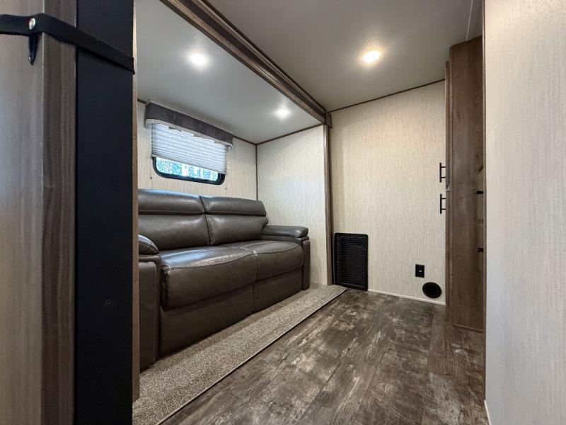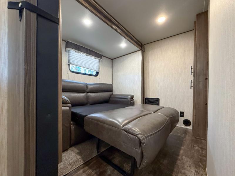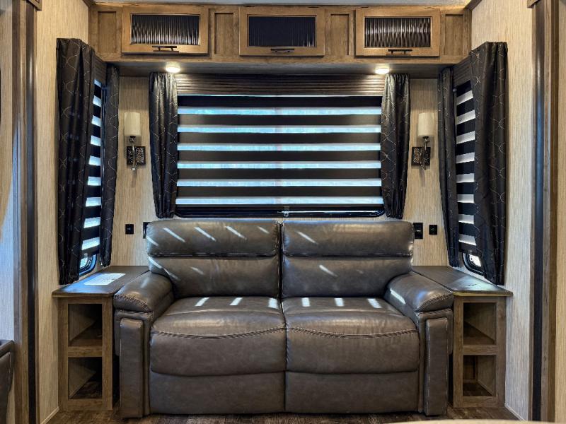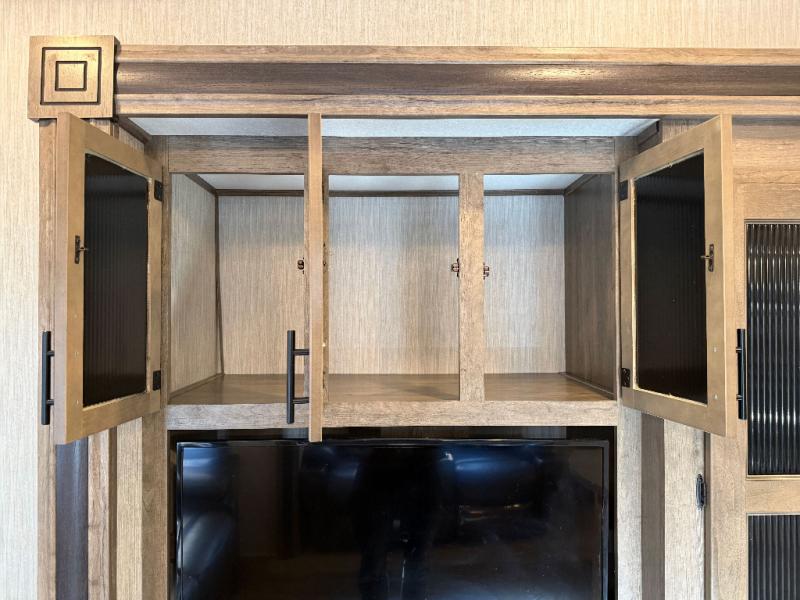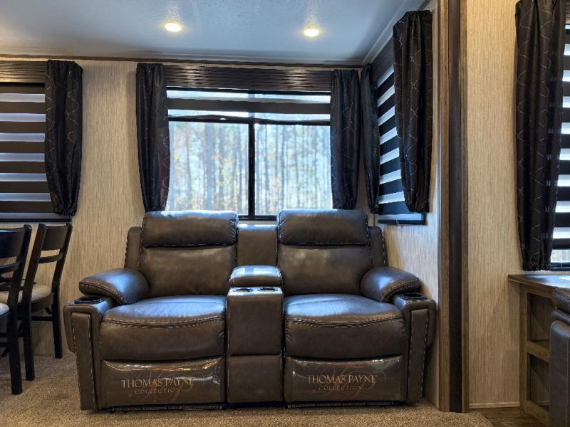 There's something for everyone in this Sabre fifth wheel! The front private bedroom includes a queen bed that can be replaced for an optional king bed and a front closet with an area prepped for the optional washer and dryer. Your guests will feel right at home in the second bedroom with a jack knife sofa, plus a closet, dresser, and wardrobe for their clothes. There is even a loft above this room for the kids. The kitchen island not only provides extra counter and storage space, but is also makes cleaning up even easier with the farm-style sink and deluxe pull-down faucet. After you have spent a fun day in the sun, head to the rear living area and relax on either the tri-fold sofa which can be transformed into an extra sleeping space or on the home theatre seating with heat and massage. As you sit back and relax, you'll find a fireplace directly across with a large residential TV above it for you to watch your favorite movie!