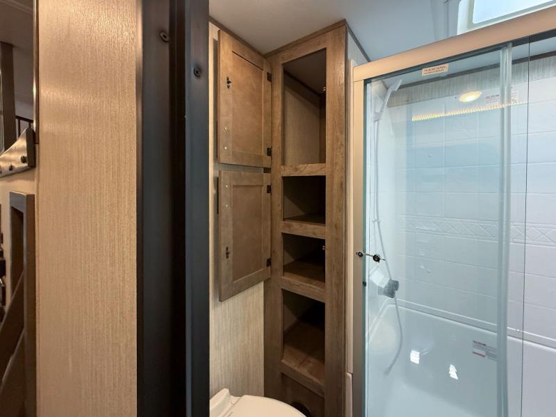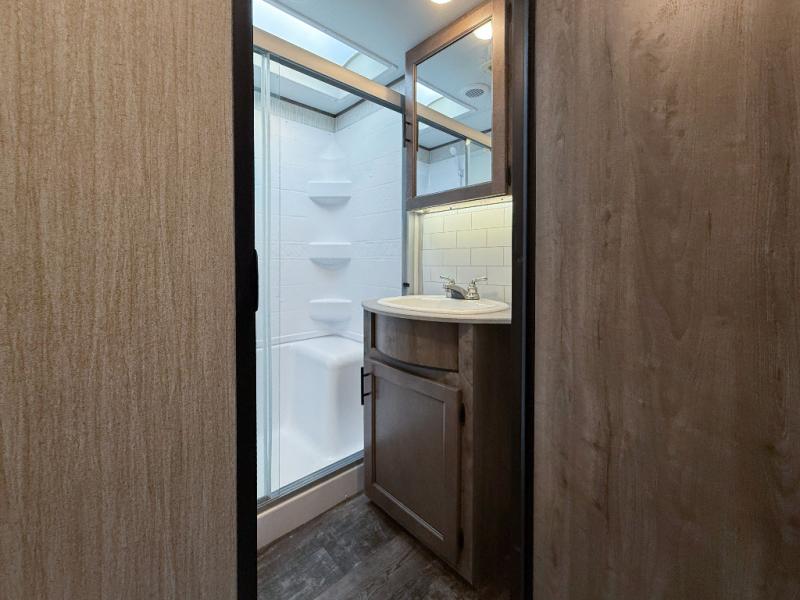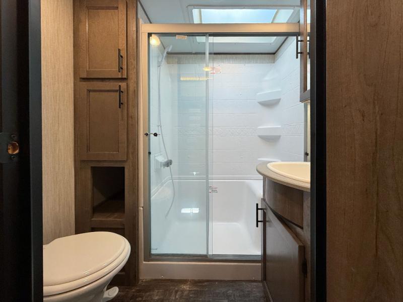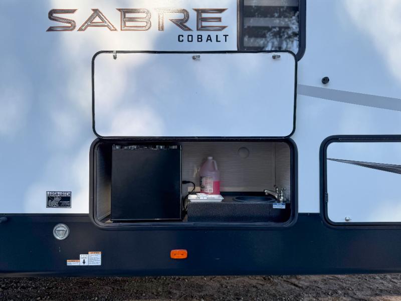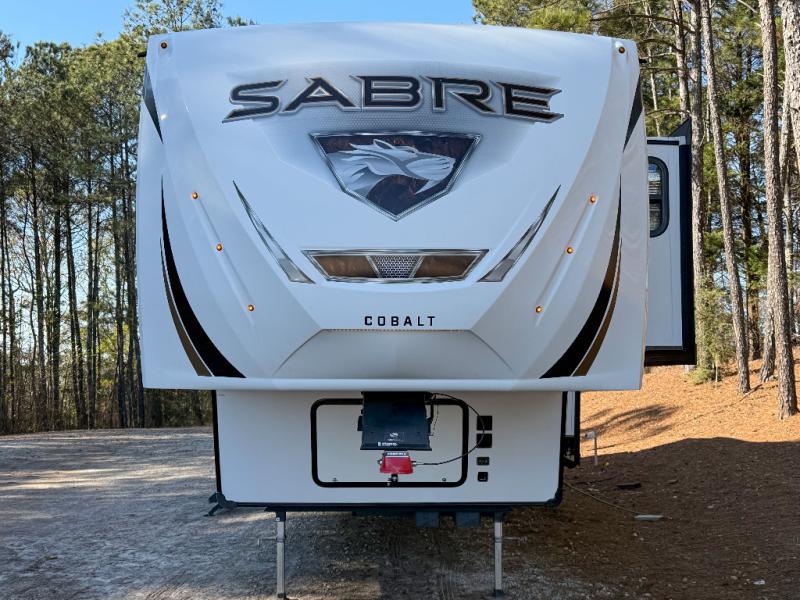 You will experience luxurious camping trips at an affordable price with any one of these Forest River Sabre fifth wheels! These models are durable and ready to travel anytime of the year thanks to features like the high-gloss gel-coat front cap with LED lighting, the reflective white PVC roof membrane, and the forced air underbelly with enclosed gate valves. The electric auto-leveling system makes setting up easy and safe, and the adjustable power awning with LED lighting will create an inviting outdoor living space. Each model includes a universal docking station which includes a black tank flush and an outside shower, and the backlit "Secure Step" landing for you to enter and exit the unit safely. Inside, you will love the design of the ambient accent lighting above the crown molding in the living area, the real wood lumbercore cabinetry, and the vintage gaslight decorative lighting!