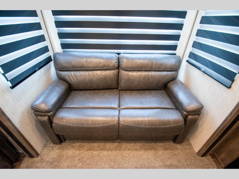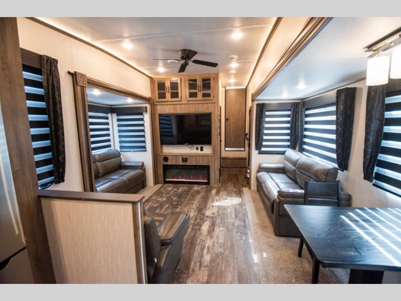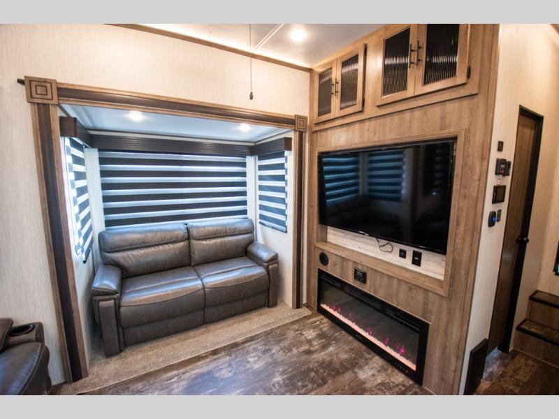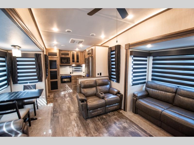 The amenities found in this fifth wheel are exceptional! There is a full bathroom with a dual-sink vanity, a shower, and a full-size wardrobe within the front master suite that will allow you to spend your evenings in complete comfort and convenience. There is an additional half bathroom located right next to the main living area so that your guests also have access to their own facilities while staying the night on the two tri-fold hide-a-bed sofas. You and your spouse can relax on the home theatre seating that is directly across from the residential-size LED TV. And everyone will appreciate finding a residential refrigerator in the rear kitchen late at night when a sugar craving strikes. You can even sit down at the free-standing table with chairs to enjoy that late-night snack.