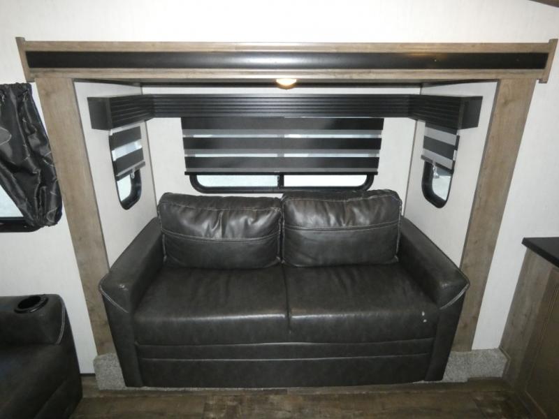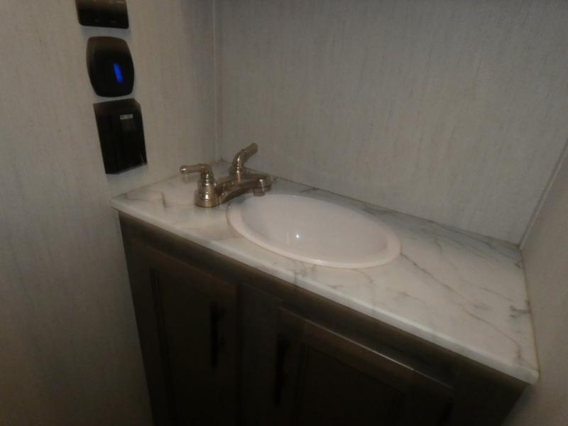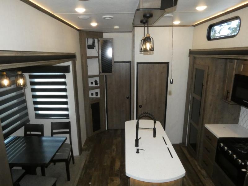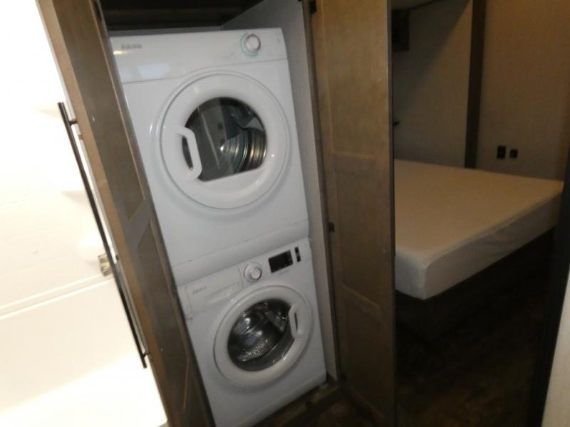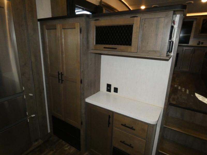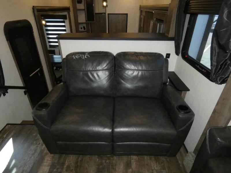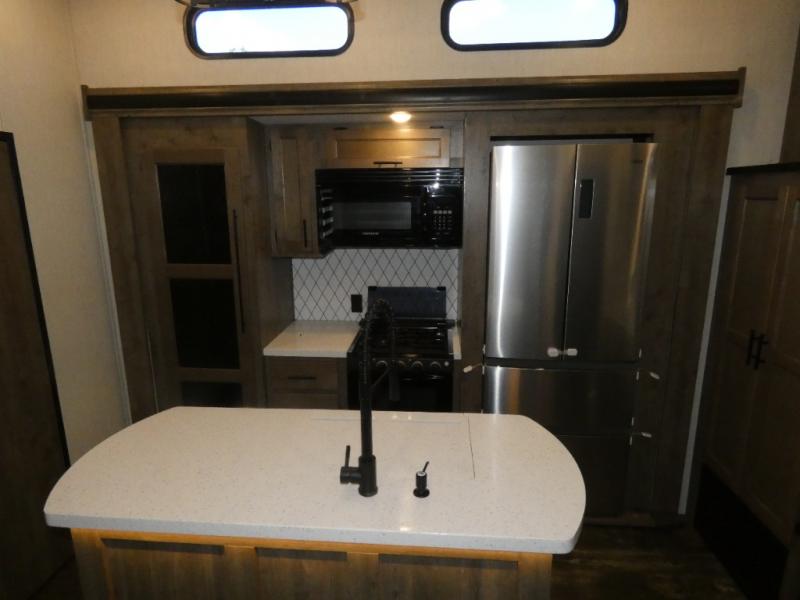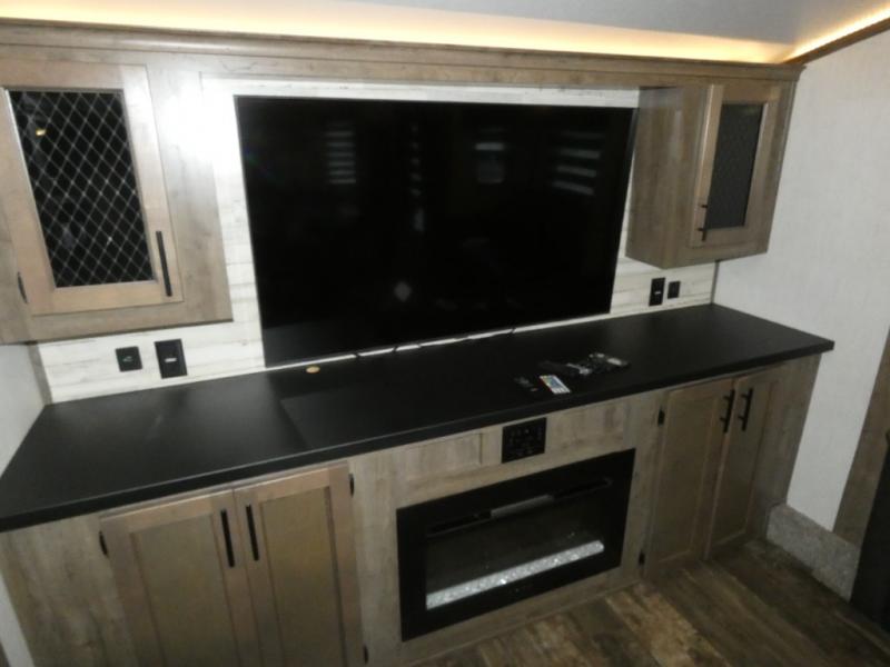 This Sabre fifth wheel with a full and half bath is sure to be a crowd pleaser! The front living area is the perfect place for everyone to visit each other comfortably on the two tri-fold sofas that can be transformed into extra sleeping spaces, or at the theater seating for complete relaxation. You will also find an entertainment center with a fireplace and a residential-size LED TV. This Sabre kitchen is packed out with convenient features, such as a residential refrigerator, a kitchen island, and a lighted pantry with motion sensors. The rear master suite has access to its very own full bathroom with a double-sink vanity for two to get ready at once and a wardrobe with washer and dryer so that you can extend your vacation even longer with clean clothes!