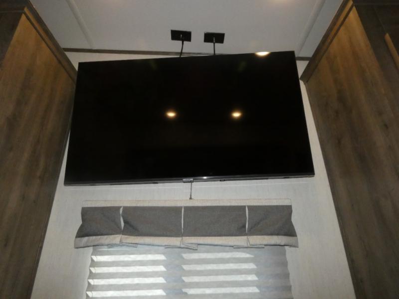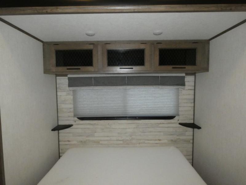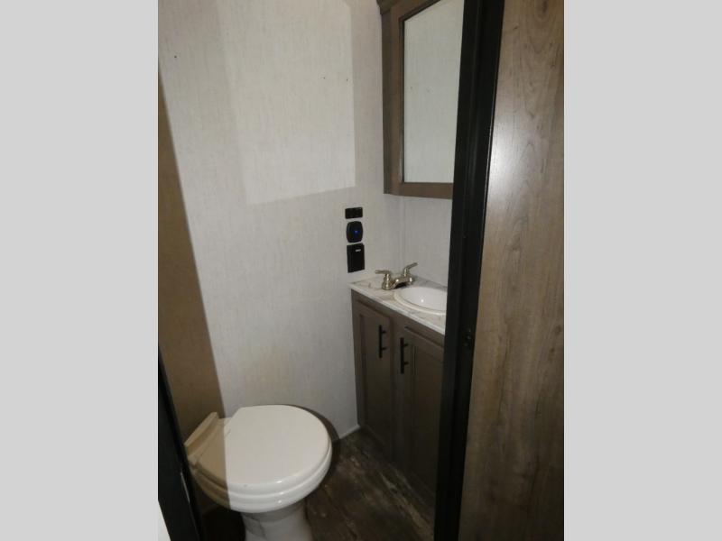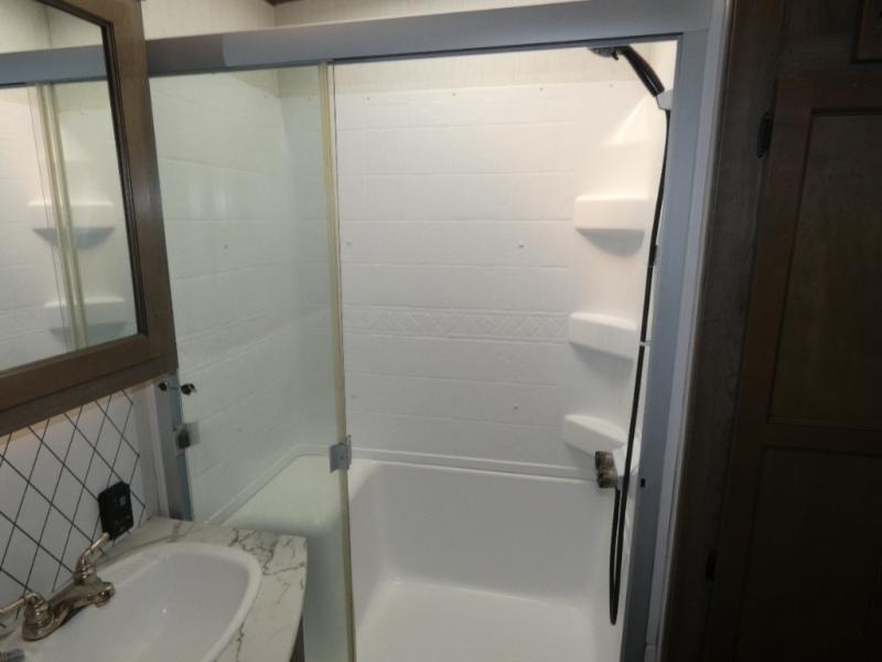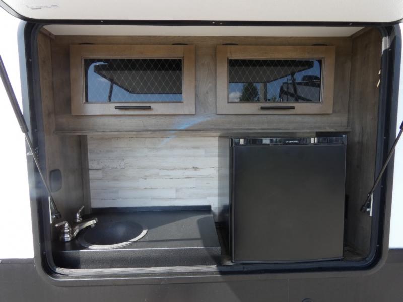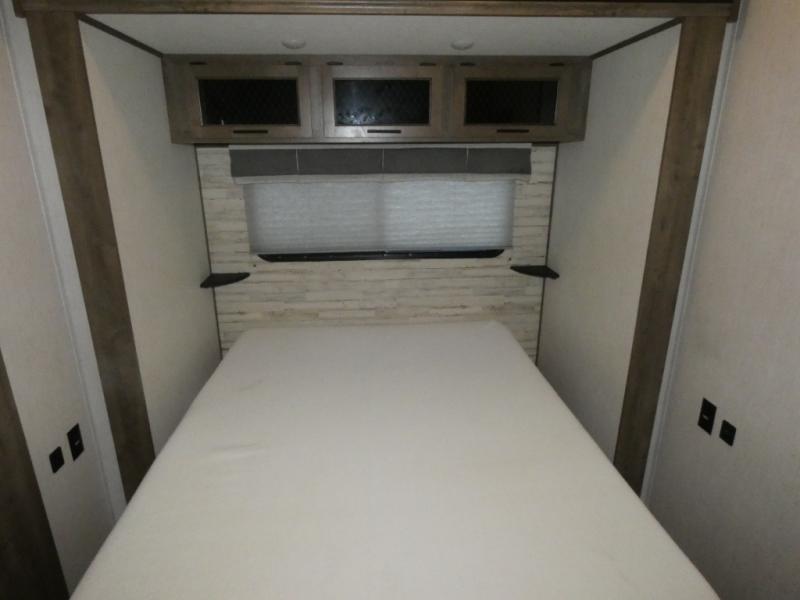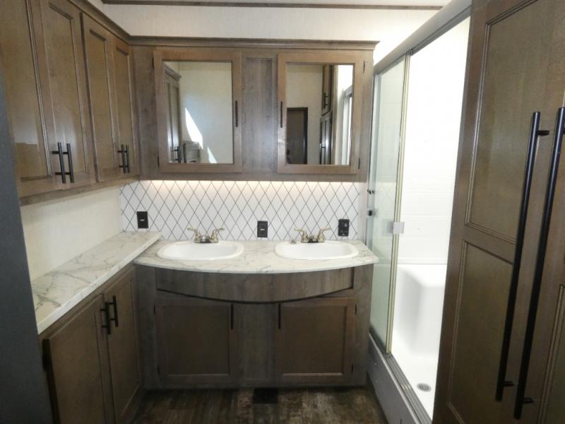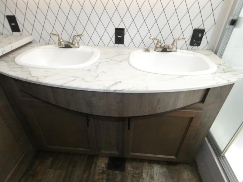 This Sabre fifth wheel with a full and half bath is sure to be a crowd pleaser! The front living area is the perfect place for everyone to visit each other comfortably on the two tri-fold sofas that can be transformed into extra sleeping spaces, or at the theater seating for complete relaxation. You will also find an entertainment center with a fireplace and a residential-size LED TV. This Sabre kitchen is packed out with convenient features, such as a residential refrigerator, a kitchen island, and a lighted pantry with motion sensors. The rear master suite has access to its very own full bathroom with a double-sink vanity for two to get ready at once and a wardrobe with washer and dryer so that you can extend your vacation even longer with clean clothes!