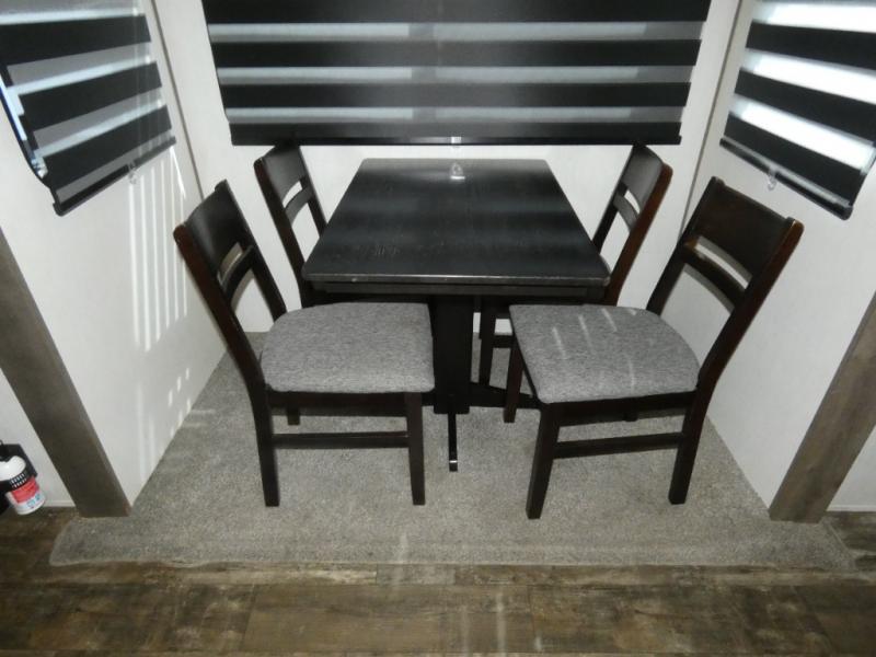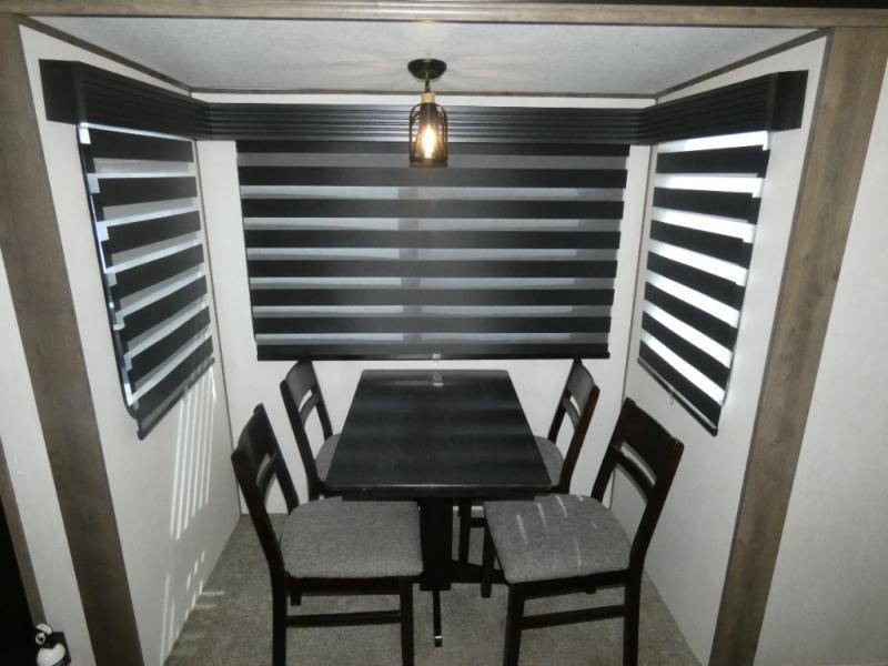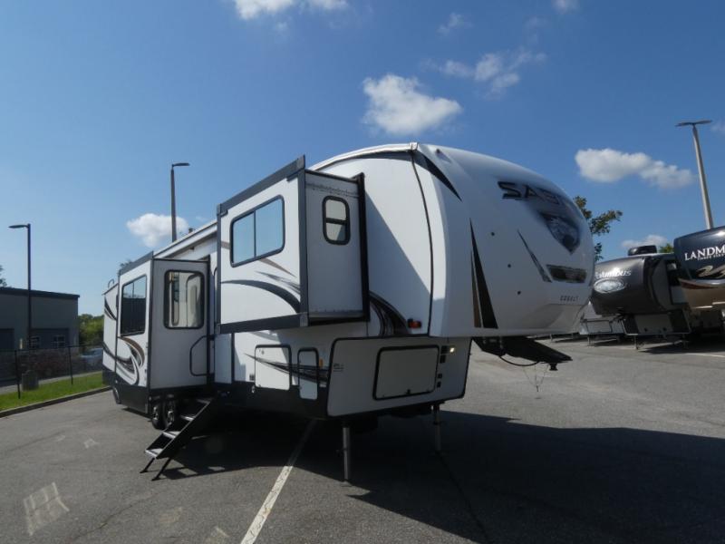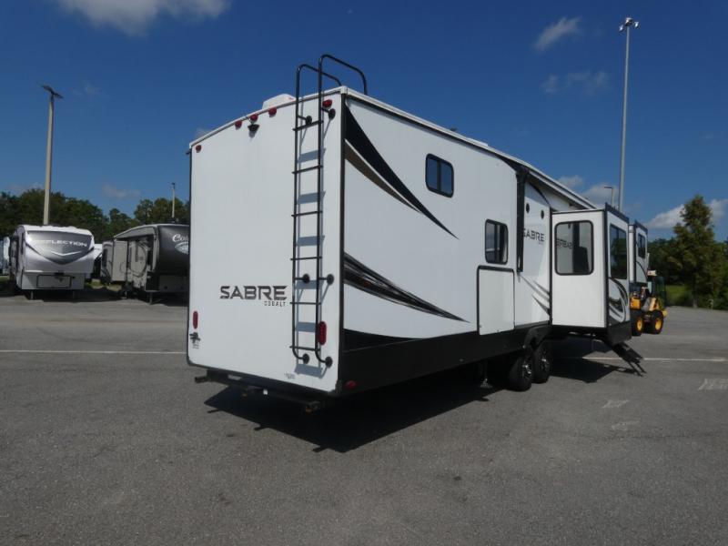 You will experience luxurious camping trips at an affordable price with any one of these Forest River Sabre fifth wheels! These models are durable and ready to travel anytime of the year thanks to features like the high-gloss gel-coat front cap with LED lighting, the reflective white PVC roof membrane, and the forced air underbelly with enclosed gate valves. The electric auto-leveling system makes setting up easy and safe, and the adjustable power awning with LED lighting will create an inviting outdoor living space. Each model includes a universal docking station which includes a black tank flush and an outside shower, and the backlit "Secure Step" landing for you to enter and exit the unit safely. Inside, you will love the design of the ambient accent lighting above the crown molding in the living area, the real wood lumbercore cabinetry, and the vintage gaslight decorative lighting!