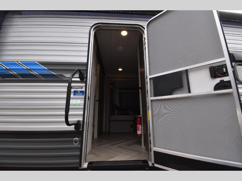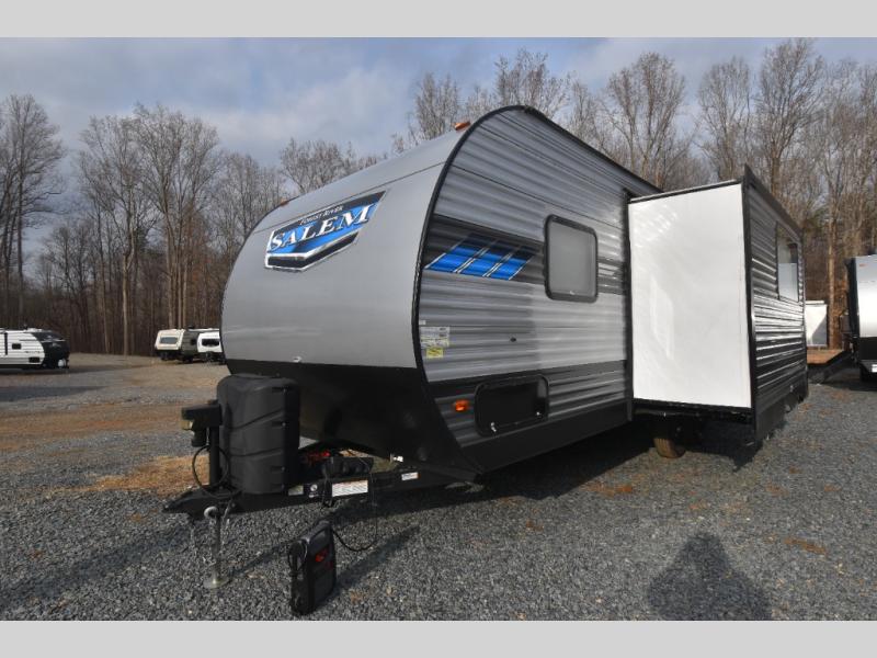 Set your sights on this Salem travel trailer that can comfortably sleep four people which makes it the perfect unit for a small family. After you've set up camp and had a look around the campground, come back to this unit to enjoy lunch or take a quick rest. The chef of the family can cook on the three-burner cooktop or make something quick in the microwave, and the 8' chaise lounge will be a perfect spot to relax or play a game of cards. You'll appreciate the full rear bath that includes a walk-in shower and a closet for extra towels. This unit also features a front private bedroom with a queen bed that you are sure to love, and you'll find plenty of storage space throughout, including an exterior pass-through compartment for the fishing poles.
