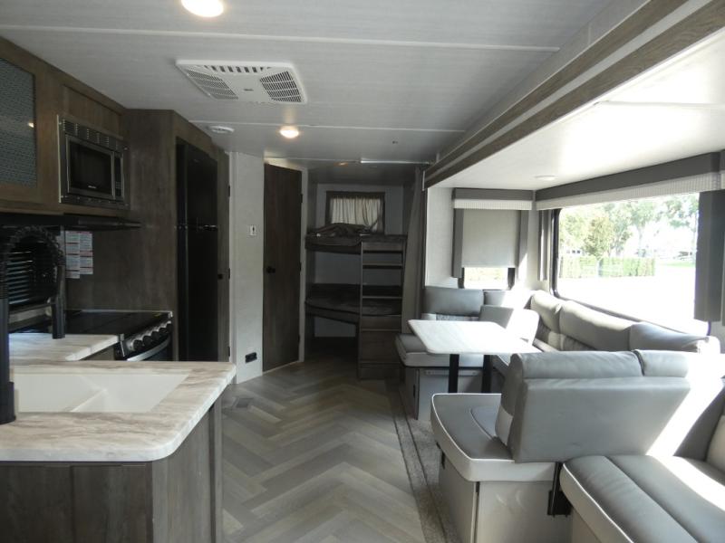 As you get away for the weekend to enjoy nature's beauty, you'll be so glad that you chose to bring this Salem travel trailer along! The full kitchen with its three-burner cooktop and walk-in pantry will allow you to prep meals whenever it is convenient for you, and the large slide that contains the extremely functional Versa Lounge will deliver extra space to the interior so that you don't feel cramped. Your kids will be able to invite a friend or two because of the double-size bunks that are in the back, and since these bunks are right next to the full bathroom with a walk-in shower, your kids won't have to search far in the middle of the night.