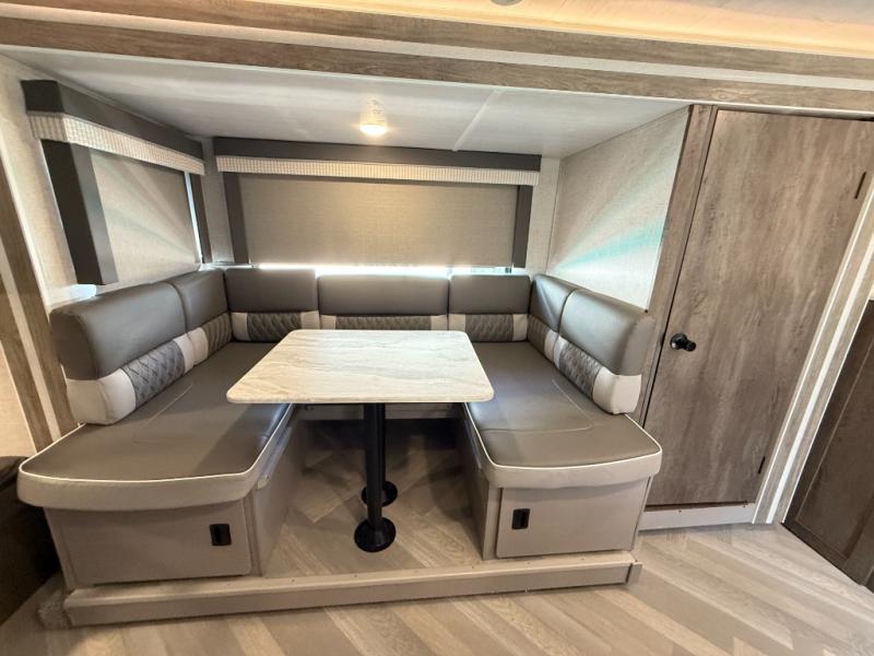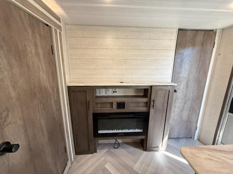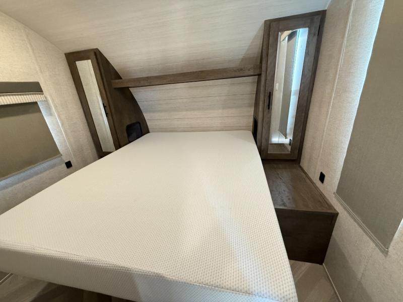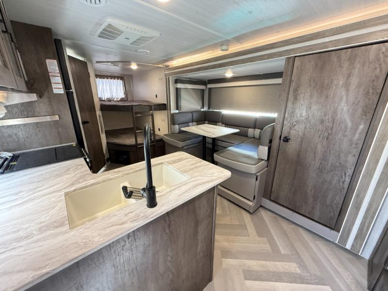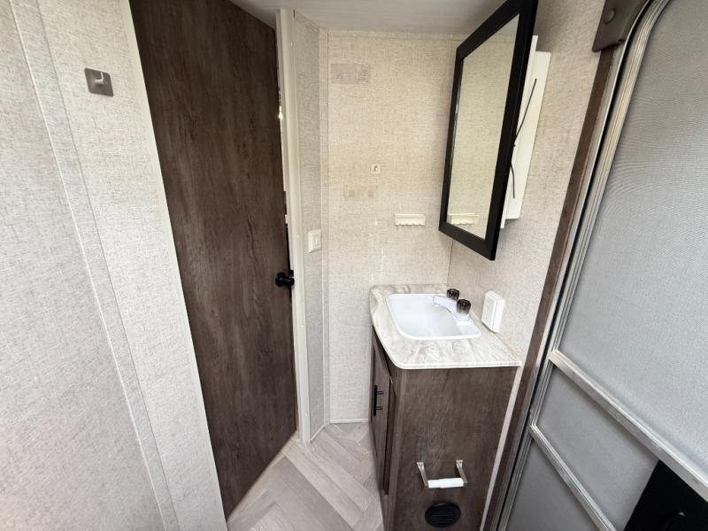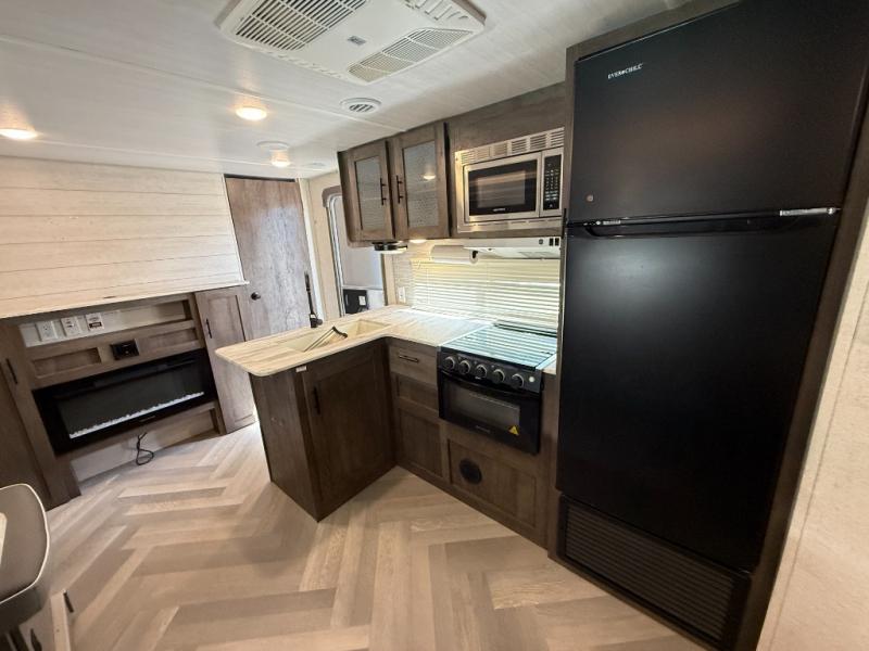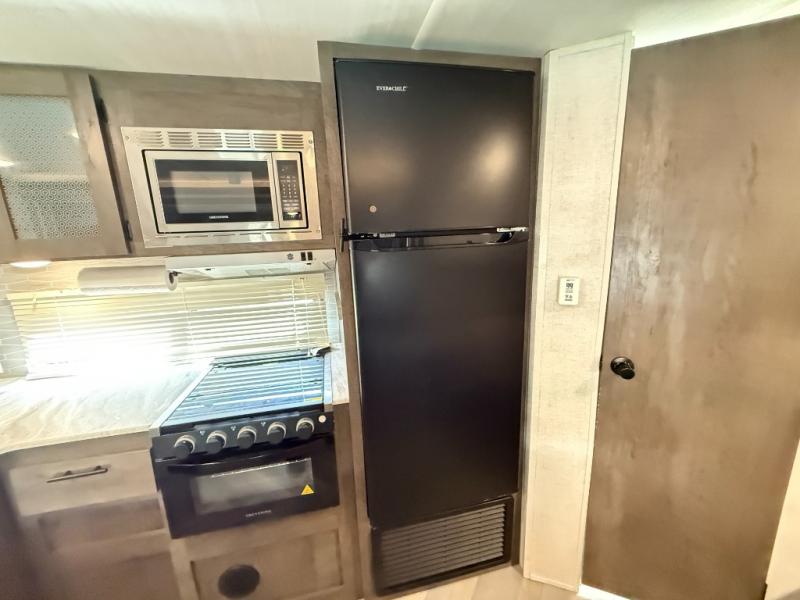 This travel trailer is big enough for the whole family to join in on the fun and weighs in at less than 6,000 lbs! The kiddos can sleep on the corner 46" 74" double-over-double bunk beds, and you can sleep on the queen bed inside the front private bedroom, plus the U-shaped dinette can transform into an extra sleeping space. It also has a panoramic window for you to look out at your beautiful scenery while you eat. The rear corner bathroom has everything you will need to get squeaky clean each morning, as well as an exit/entrance door to the unit. The oversized 11 cu. ft. refrigerator will keep your perishables fresh and the three burner cooktop is just waiting for you to create a delicious meal, plus the walk-in pantry is big enough to store everyone's favorite snacks!
