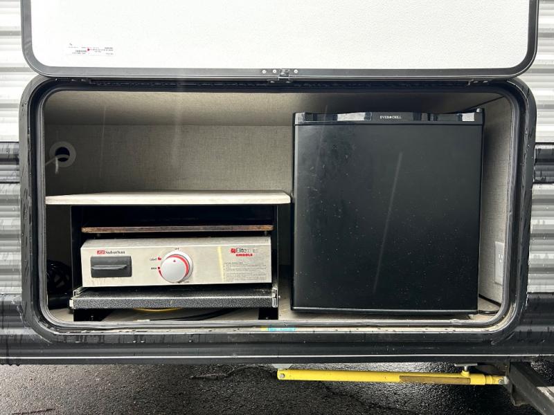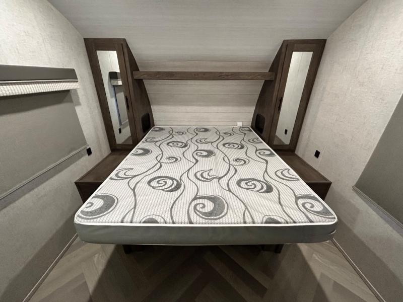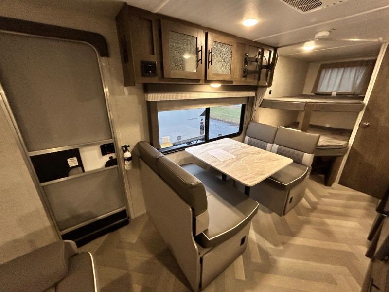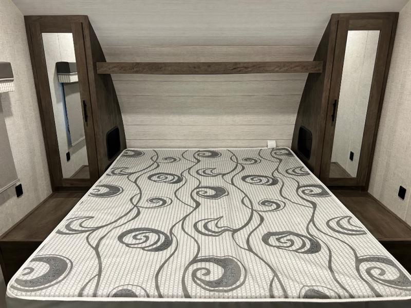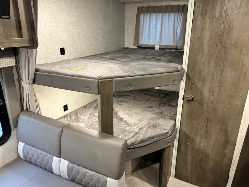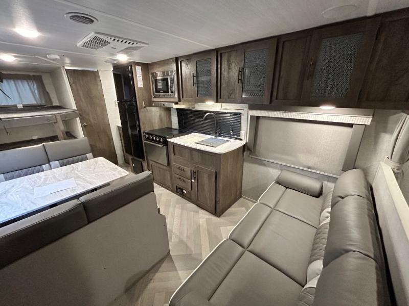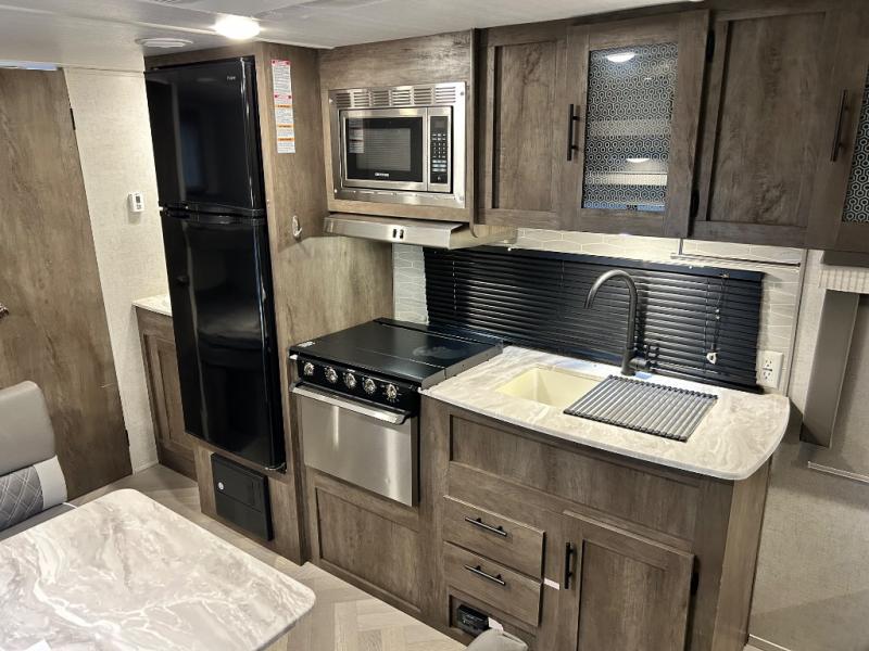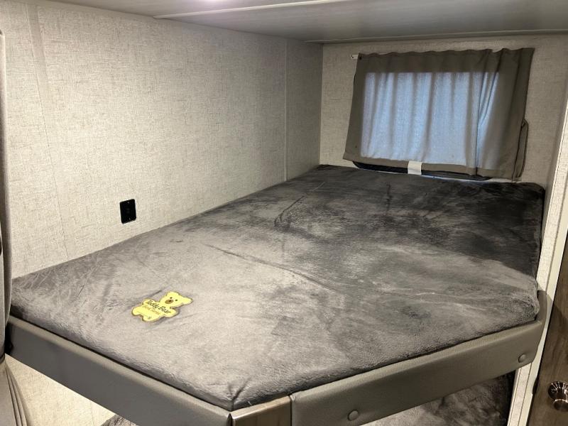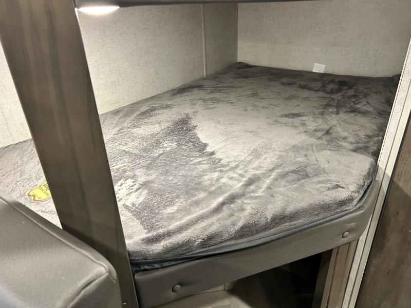 Load up this light weight travel trailer with bunk beds and head to your favorite campsite! There is plenty of seating and sleeping spaces between the rear 48" x 74" double over double bunk beds, the queen bed, the booth dinette, and the sofa. The front queen bed has closets on either side of it and a privacy curtain to draw at night. The oversized 11 cu. ft. refrigerator will keep your perishables fresh and the three burner cooktop is just waiting for you to prepare a delicious home cooked meal. You can also choose to add the optional outside kitchen for a hot breakfast outside at sunrise!