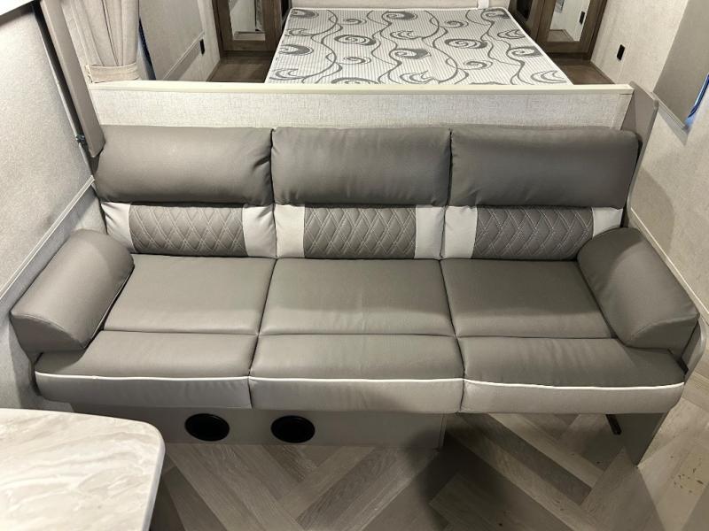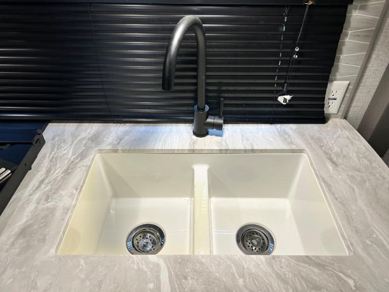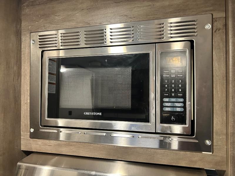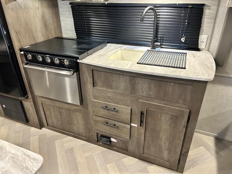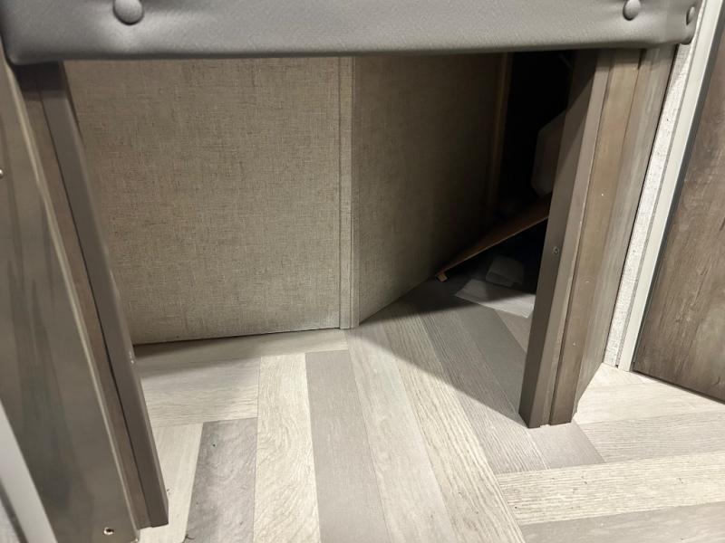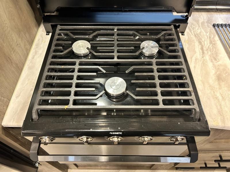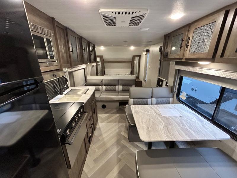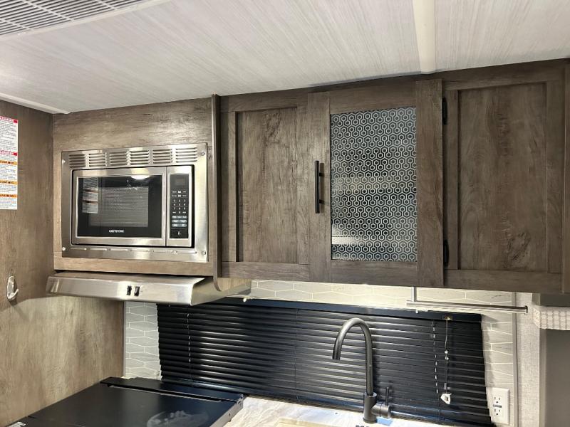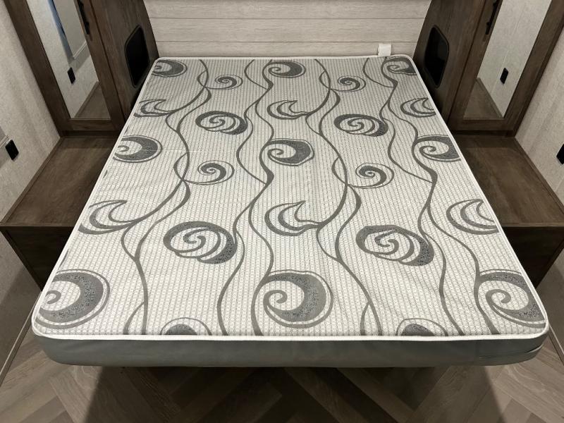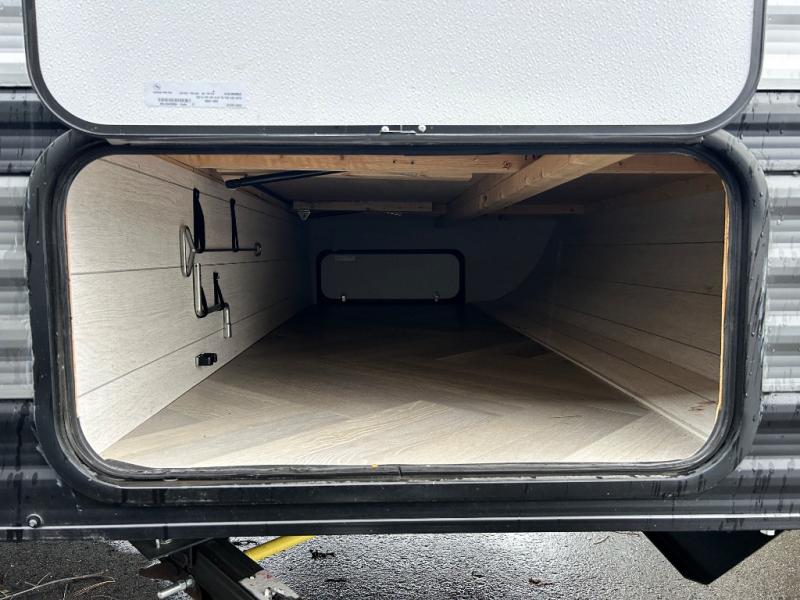Load up this light weight travel trailer with bunk beds and head to your favorite campsite! There is plenty of seating and sleeping spaces between the rear 48" x 74" double over double bunk beds, the queen bed, the booth dinette, and the sofa. The front queen bed has closets on either side of it and a privacy curtain to draw at night. The oversized 11 cu. ft. refrigerator will keep your perishables fresh and the three burner cooktop is just waiting for you to prepare a delicious home cooked meal. You can also choose to add the optional outside kitchen for a hot breakfast outside at sunrise!