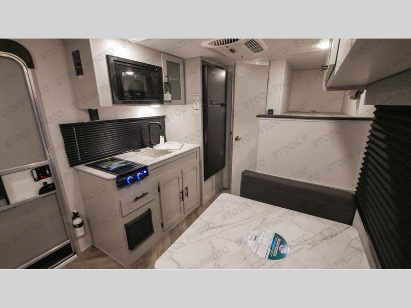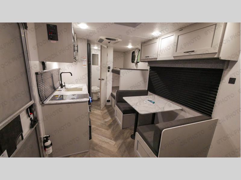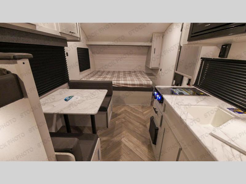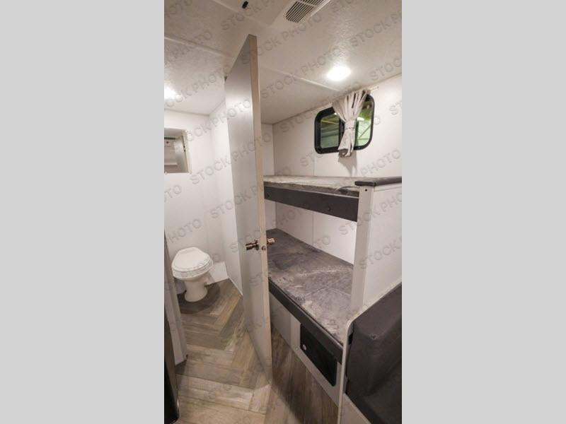 The kids are laughing and talking before bedtime while they lie on their bunk bed, their cousin is asleep on the folded-down booth dinette, and you are reading a book while lying on your own RV queen bed up front. What could be better? Or maybe you've taken a trip away with friends, and you stayed up late playing a game or chatting through the night. The next morning you can wake up to take a shower and get dressed in privacy, make breakfast inside with the upgraded appliance package, or drink your coffee under the 12' power awning with adjustable legs, all before you start your day of exploring and enjoying the great outdoors.