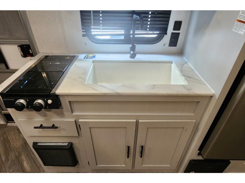 Let all of your adventures be wild with this Salem FSX travel trailer! The U-shaped dinette rests upon a single slide so that it can move out of the way and allow you to cook freely in the kitchen. You'll appreciate having an additional lounge spot on the sofa when the Murphy bed is folded away during the day, and for fun meal prep in the great outdoors, simply walk outside to the outdoor kitchen where you can grill up some chicken and veggies for dinner. You can also travel confidently knowing that everyone will have a comfortable place to sleep because of the double-size bunks that have been included.